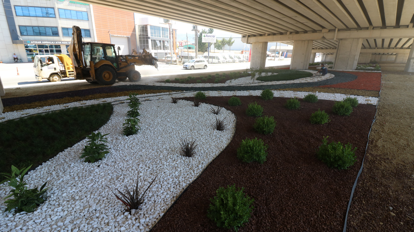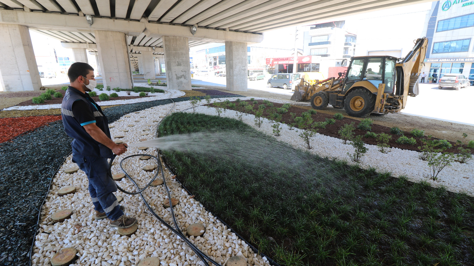 Çevre düzenlemesinin sona yaklaşıldığı köprülü kavşaktaki çalışmalar 6 bin 22 metrekare alanda gerçekleştiriliyor. Çalışma dahilinde kavşağa canlılık katacak farklı renklerde yonga ve taş kullanılıyor. Yapılan çalışma ile kavşak ve çevresi estetik acıdan zenginleşiyor.