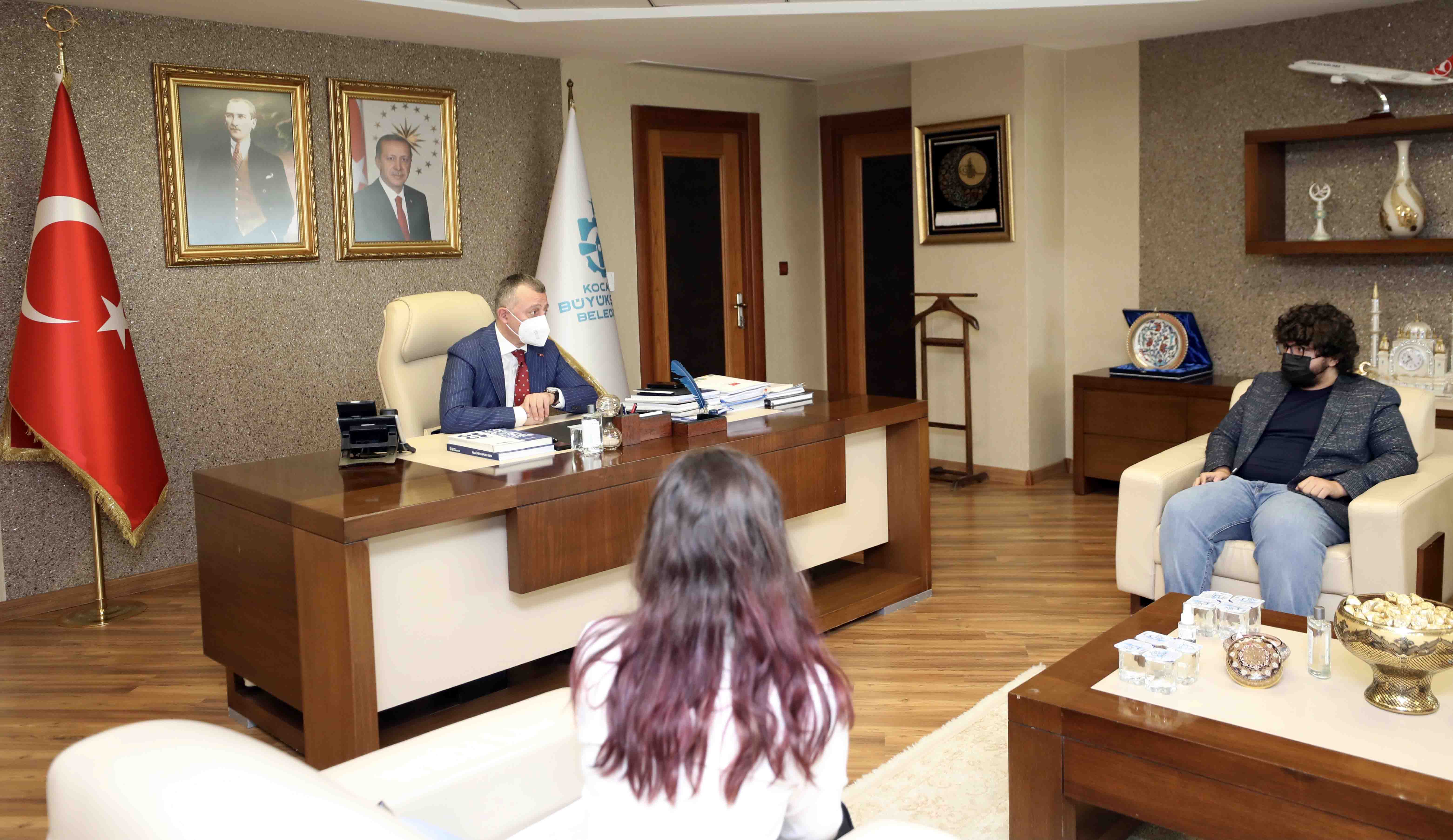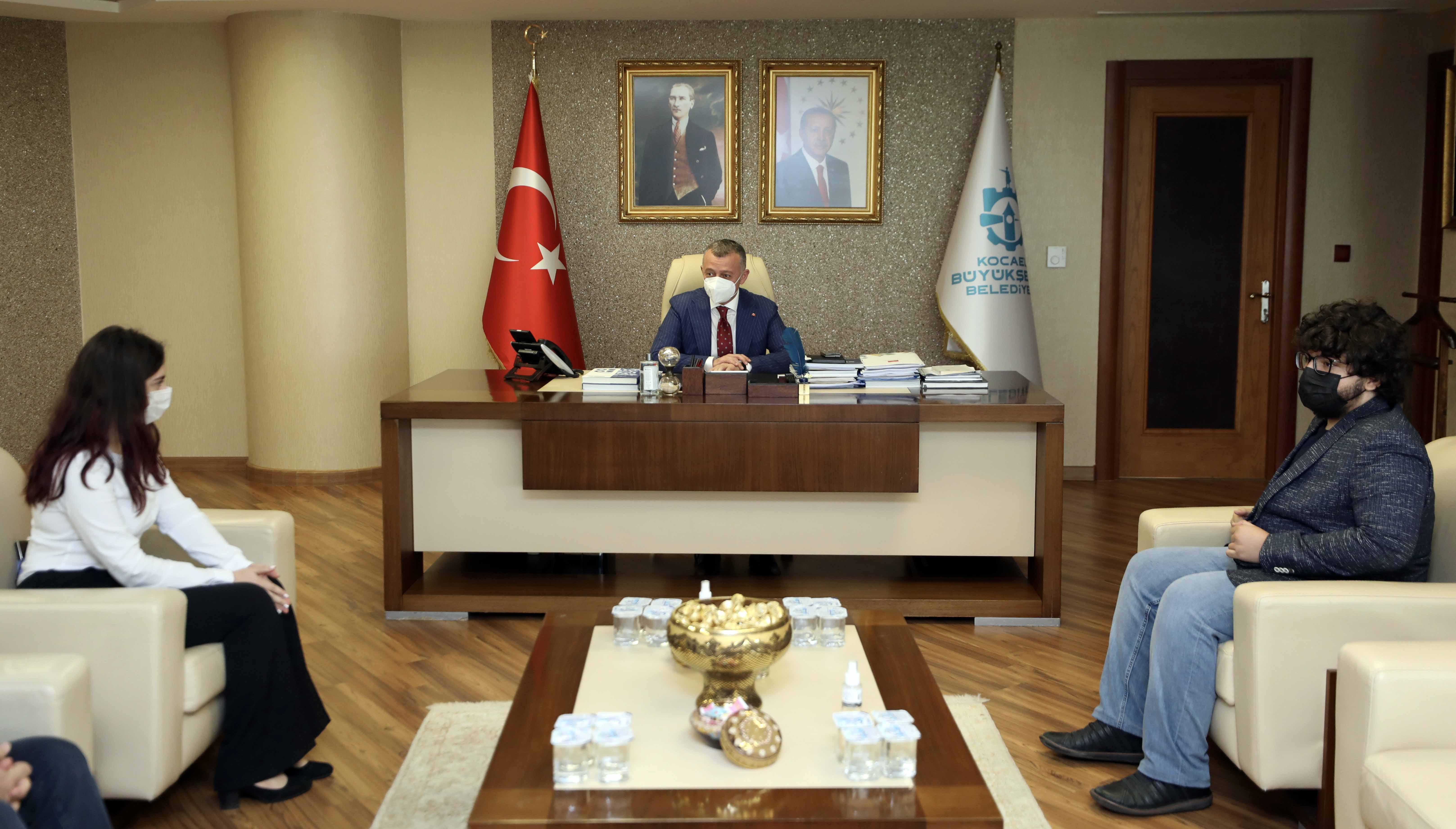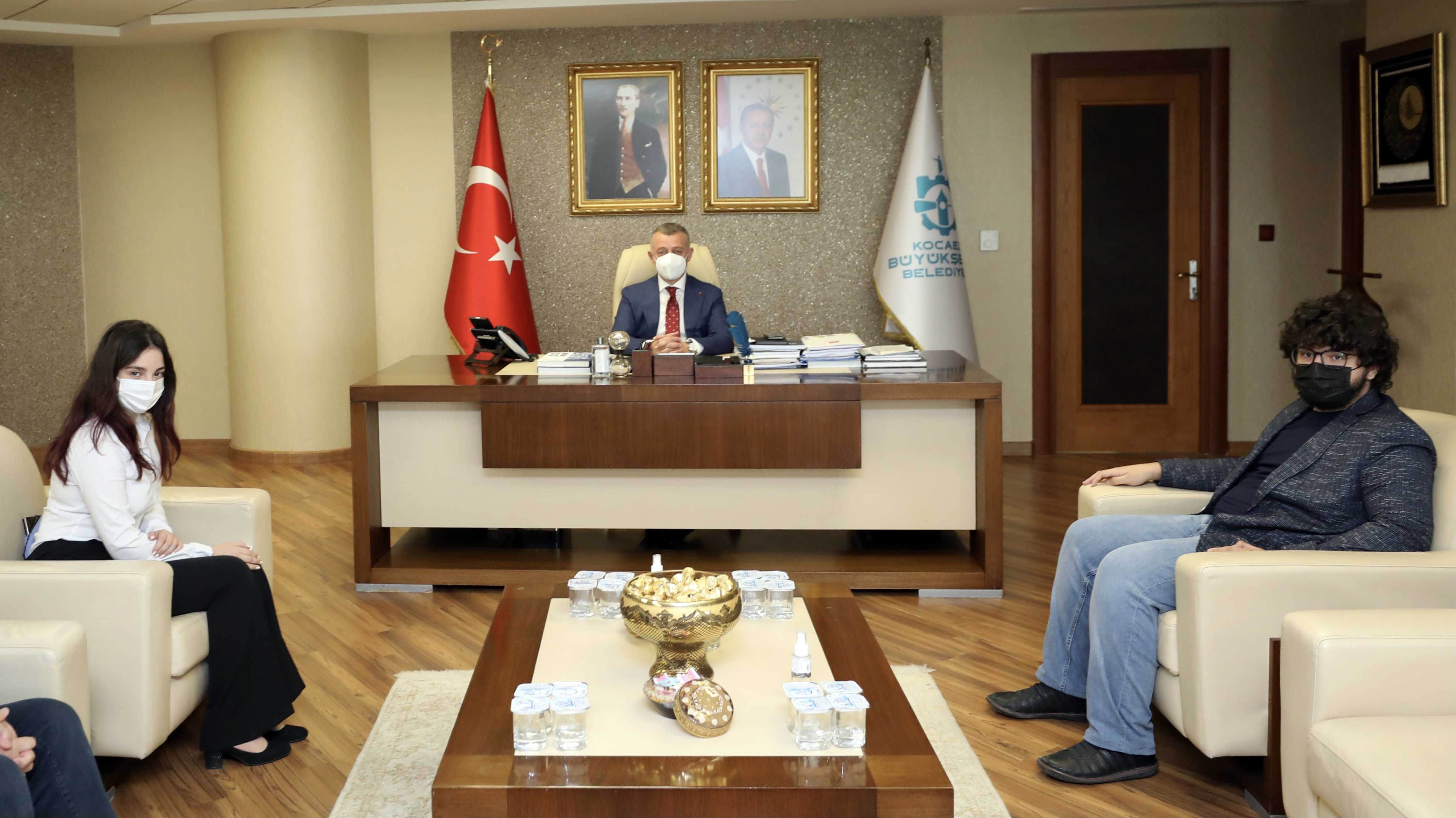 Marmara Belediyeler Birliği ve Kocaeli Büyükşehir Belediye Başkanı Doç. Dr. Tahir Büyükakın, ABD’de düzenlenen Uluslararası Bilim ve Mühendislik Fuarı olan REGENERON ISEF’te Dünya 4’üncüsü olarak ülkemiz ve kentimizi gururlandıran öğrenciler Kerem Bayhan ile Dilay Dal’ı makamında konuk etti. İl Milli Eğitim Müdürü Fehmi Rasim Çelik ve Büyükşehir Belediyesi Genel Sekreter Yardımcısı Sadık Uysal’ın da yer aldığı ziyarette, Mühendislik Mekaniği alanında Dünya 4’üncüsü olan İzmit Bilim ve Sanat Merkezi öğrencisi Kerem Bayhan ile Robotik ve Akıllı Makineler alanında Dünya 4’üncüsü olan Kocaeli Özel Enka Mesleki ve Teknik Anadolu Lisesi öğrencisi Dilay Dal ile büyük gurur duyduğunu ifade eden Başkan Büyükakın, “Yakalanan bu başarıda sizleri tebrik ediyorum. Sizi yetiştiren ve emek veren öğretmenlerinizle birlikte ailelerinizi de kutluyorum” dedi.