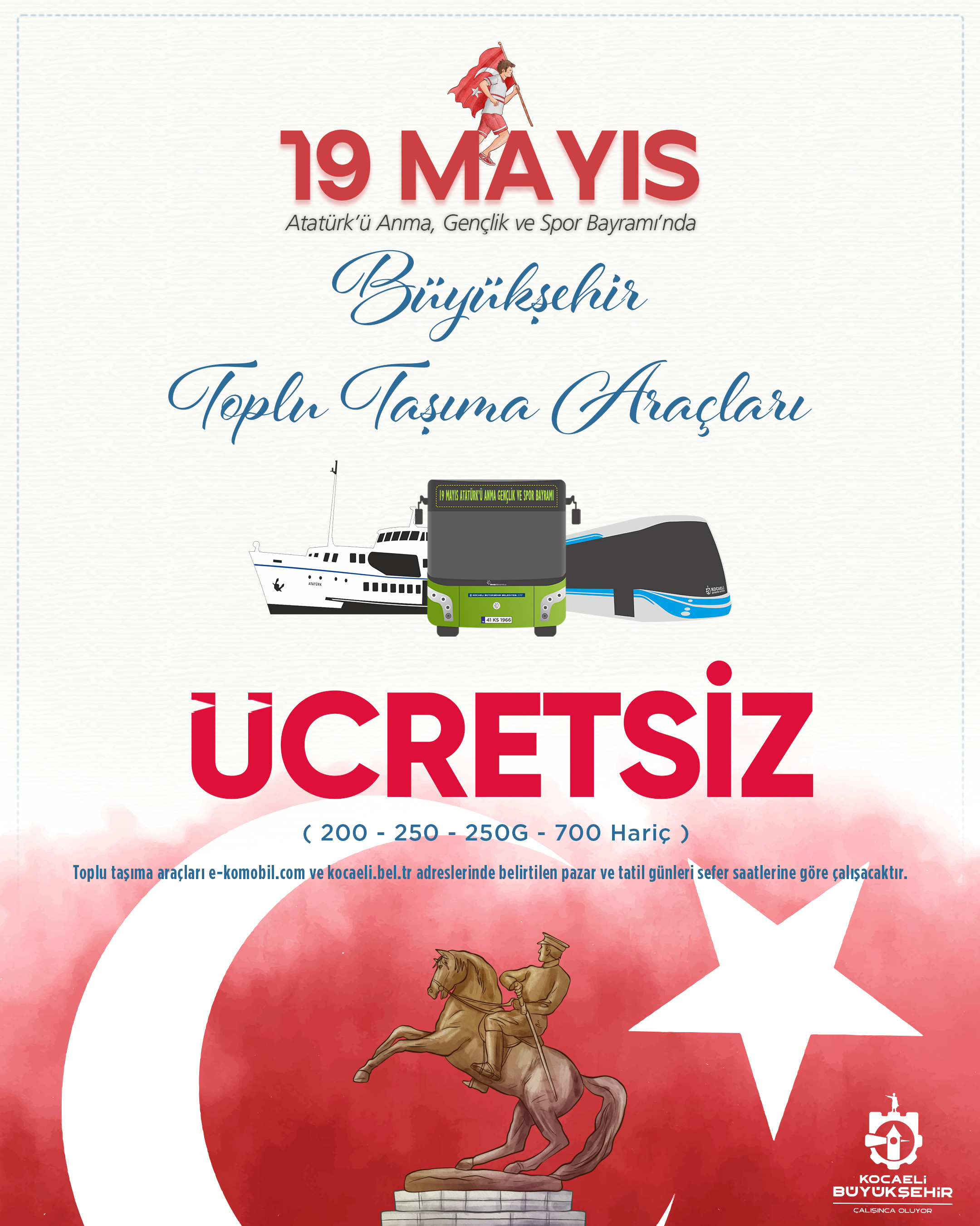Kocaeli Büyükşehir Belediyesi, 19 Mayıs Gençlik ve Spor Bayramı’nda ulaşım hizmetini ücretsiz verecek. Büyükşehir’e ait toplu taşıma, tramvay ve deniz ulaşımında yapılacak seferler ücretsiz olacak.