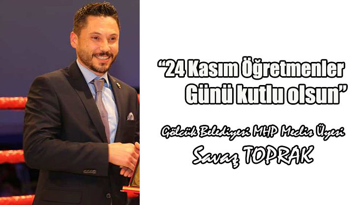 Gölcük Belediyesi MHP belediye meclis üyesi Toprak; “Başöğretmen Gazi Mustafa Kemal Atatürk başta olmak üzere, şehit olan ve ebediyete intikal eden tüm öğretmenlerimizi rahmet ve minnetle anıyor, bu kutsal görevi her zaman emekle, sabırla, şefkatle ifa eden öğretmenlerimizin 24 Kasım Öğretmenler Günü’nü kutluyorum” ifadelerini kullandı.