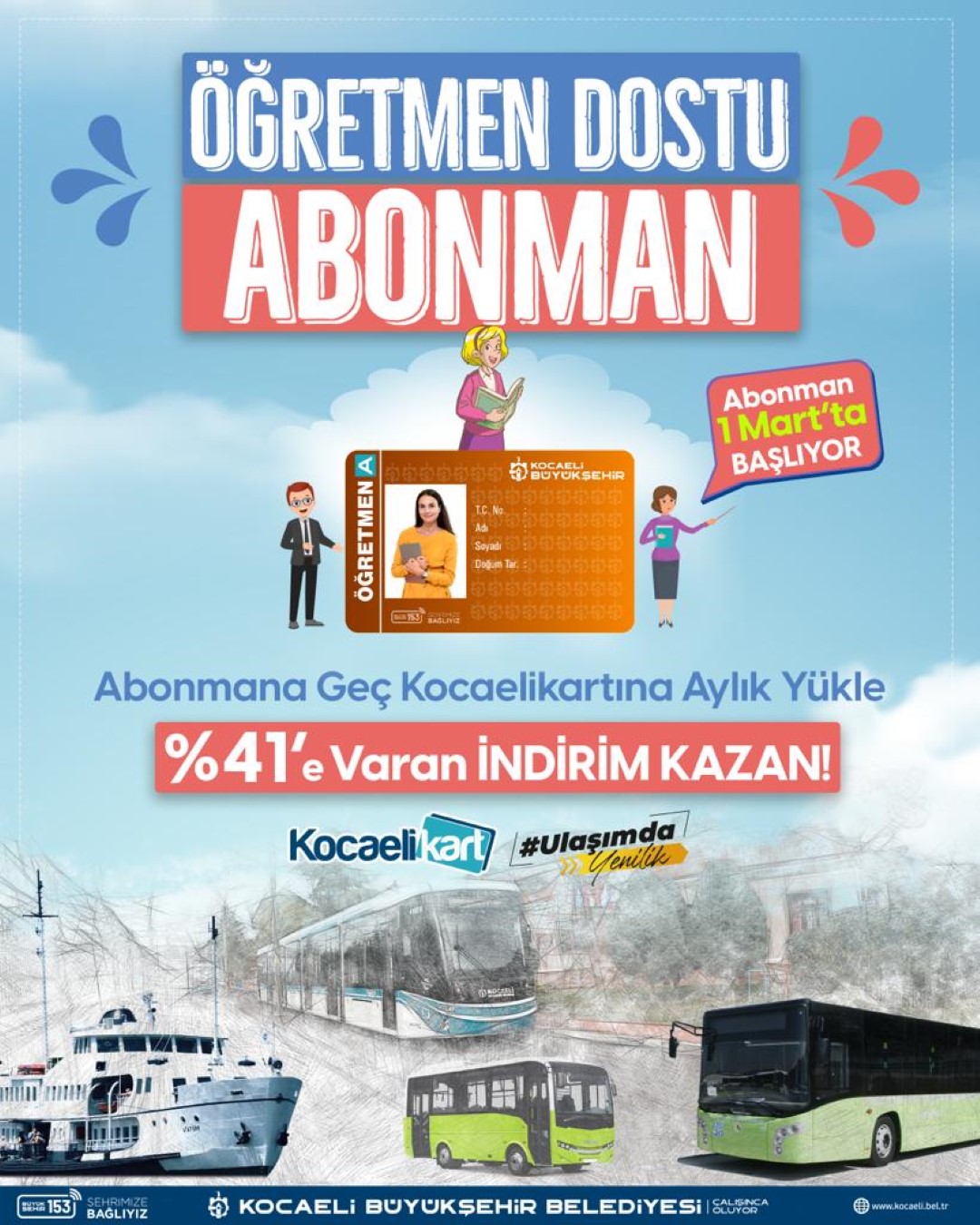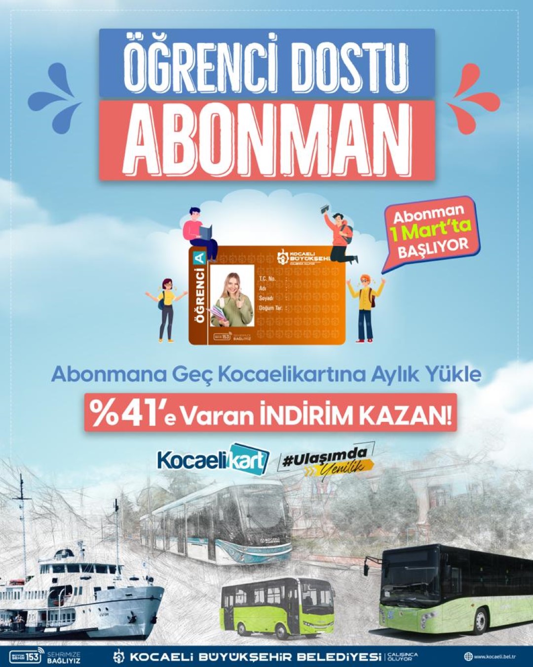 Ulaşımda birçok yeniliği gerçekleştiren Kocaeli Büyükşehir Belediyesi, şimdi de “Abonman İndirimli Kart” uygulamasını başlatıyor. Kocaeli’de bir ilk olan Abonman İndirimli Kartlar uygulamasından; Milli Eğitim Bakanlığı ve Yükseköğretim Kurumu sistemine kayıtlı olan öğrenciler, öğretmen ve 60 yaş üzerindeki vatandaşlar yararlanabilecek. Mart ayında başlayacak uygulama için abonman kart değişimleri başladı. Abonman indirimli karta geçenler %41’e varan indirimden faydalanacak.