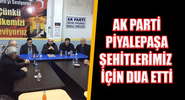 AK Parti Gölcük Piyalepaşa Mahalle Teşkilatı Şükrü Barış başkanlığında haftalık olarak düzenli yapılan toplantı da buluştu. Toplantıya Mahalle Koordinatörü İlçe Yöneticisi Mustafa Gürdal’da katıldı. Yöneticilerin yanı sıra mahalle halkının da toplantıya yoğun bir ilgi gösterdiği gözlendi. Başkan Şükrü Barış parti çalışmalarıyla ilgili bilgi verirken ayrıca bu toplantı da tüm şehitlerimiz ve ordumuzun galibiyeti için Yasin Suresi ve Fetih Suresi okundu, hep birlikte dualar edildi. Barış ayrıca yoğun tempoda çalışmalara devam ettiklerini, mahallenin sorunları ve sıkıntılarıyla da yakından ilgilendiklerini dile getirdi.
