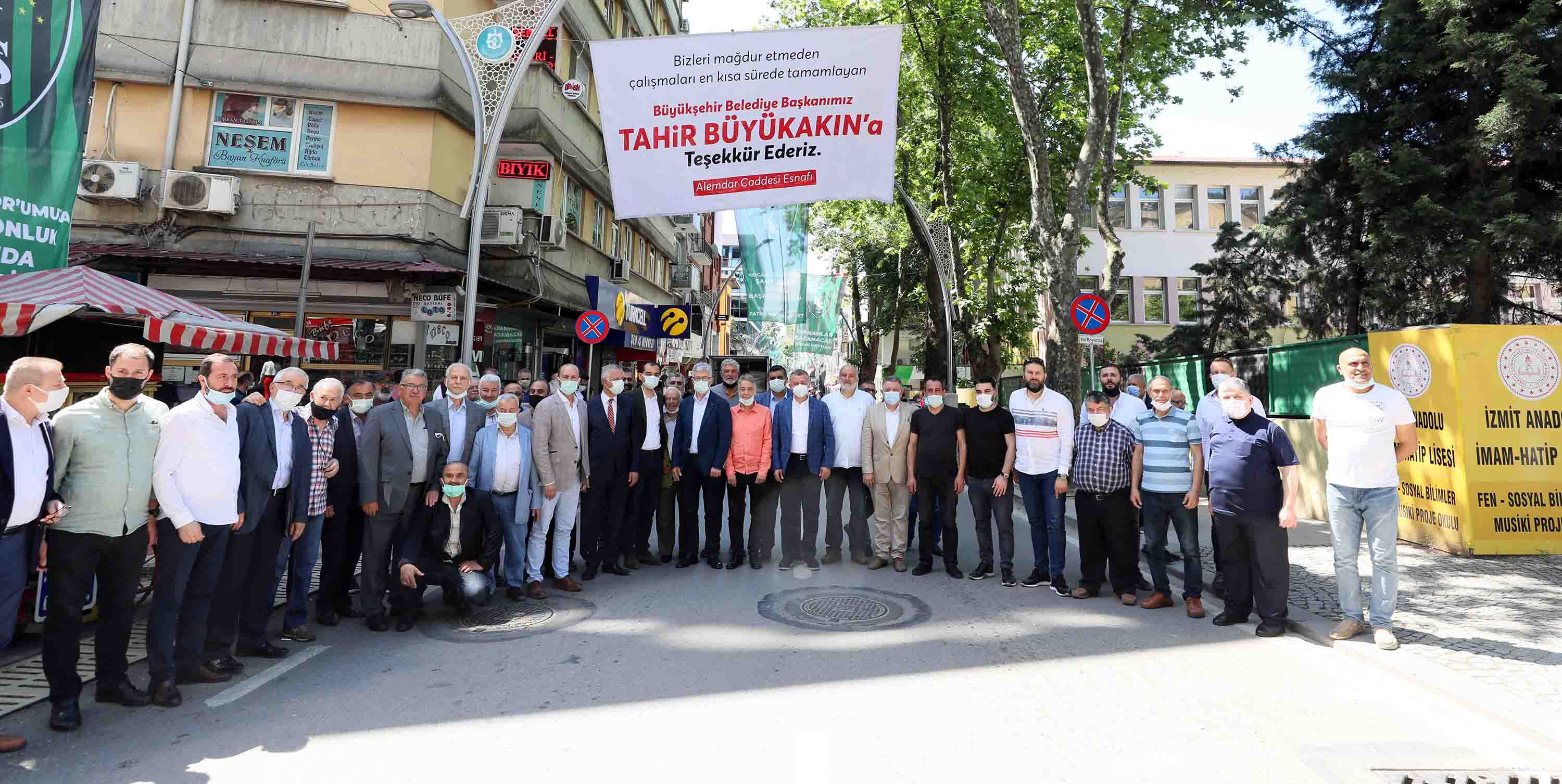 Kocaelispor şampiyonluğu için pasta kesilen organizasyonda, esnaflar adına konuşma yapan Mehmet Şen, 45 günde bitirilmesi planlanan Alemdar Caddesi’nin 28 gün gibi çok kısa bir sürede bitirilmesine teşekkür etti. İzmit içerisinde otopark taleplerini de dile getiren esnafları dikkatli bir şekilde dinleyen başkan Büyükakın, İnönü Caddesi için esnaflardan gelen talepleri oluşturulacak komisyonla Büyükşehir Belediyesi Yapı Kontrol Daire Başkanlığı ile çalışma yapılması talimatını verdi. Başkan Büyükakın, “Bölgede esnaflarımızın yapılmasını istediği çalışmaları hayata geçirmek için ortak akıllan birlikte hareket edelim. Bunların yanında gerekirse cephe giydirmesine kadar planlayalım” ifadelerini sarf etti.