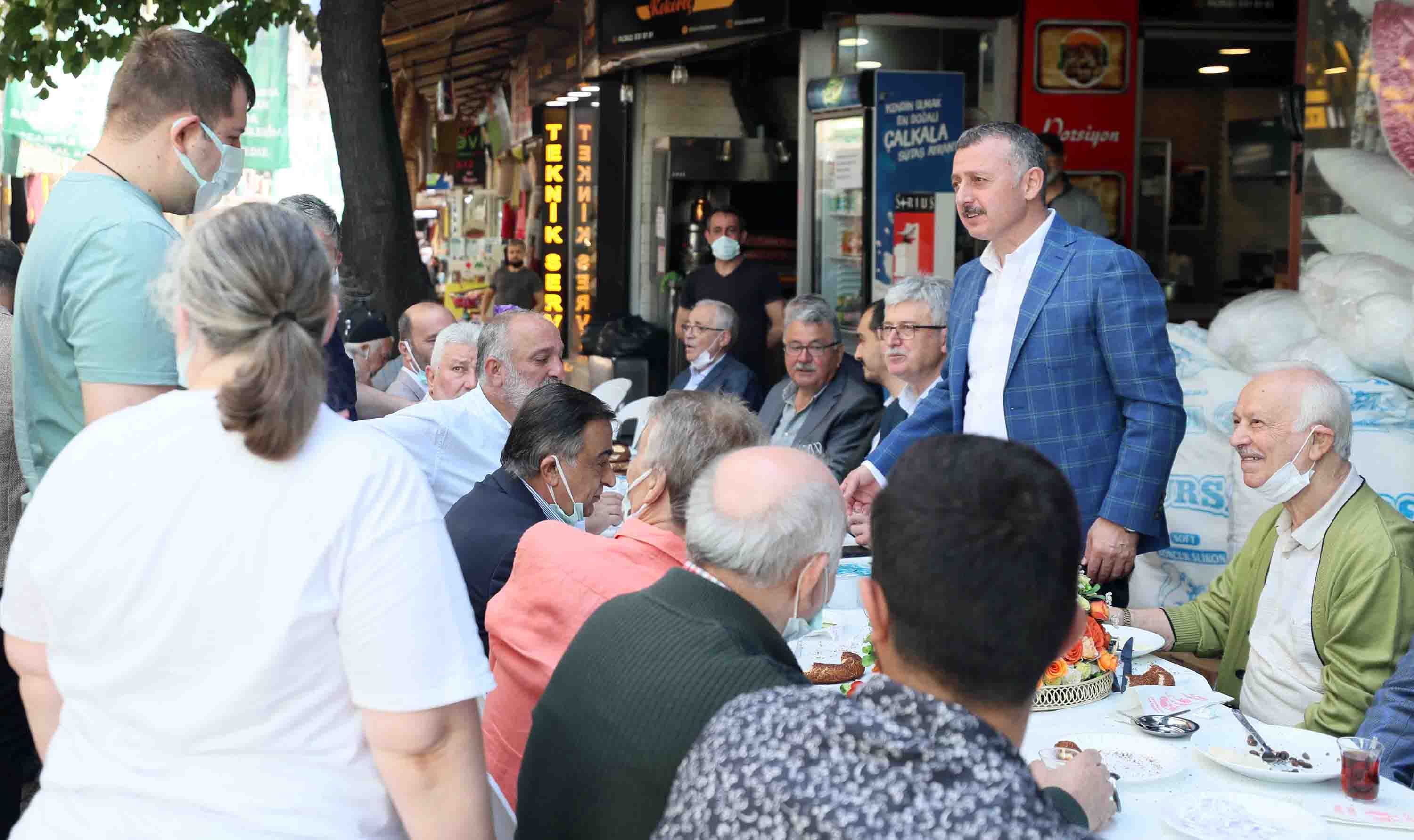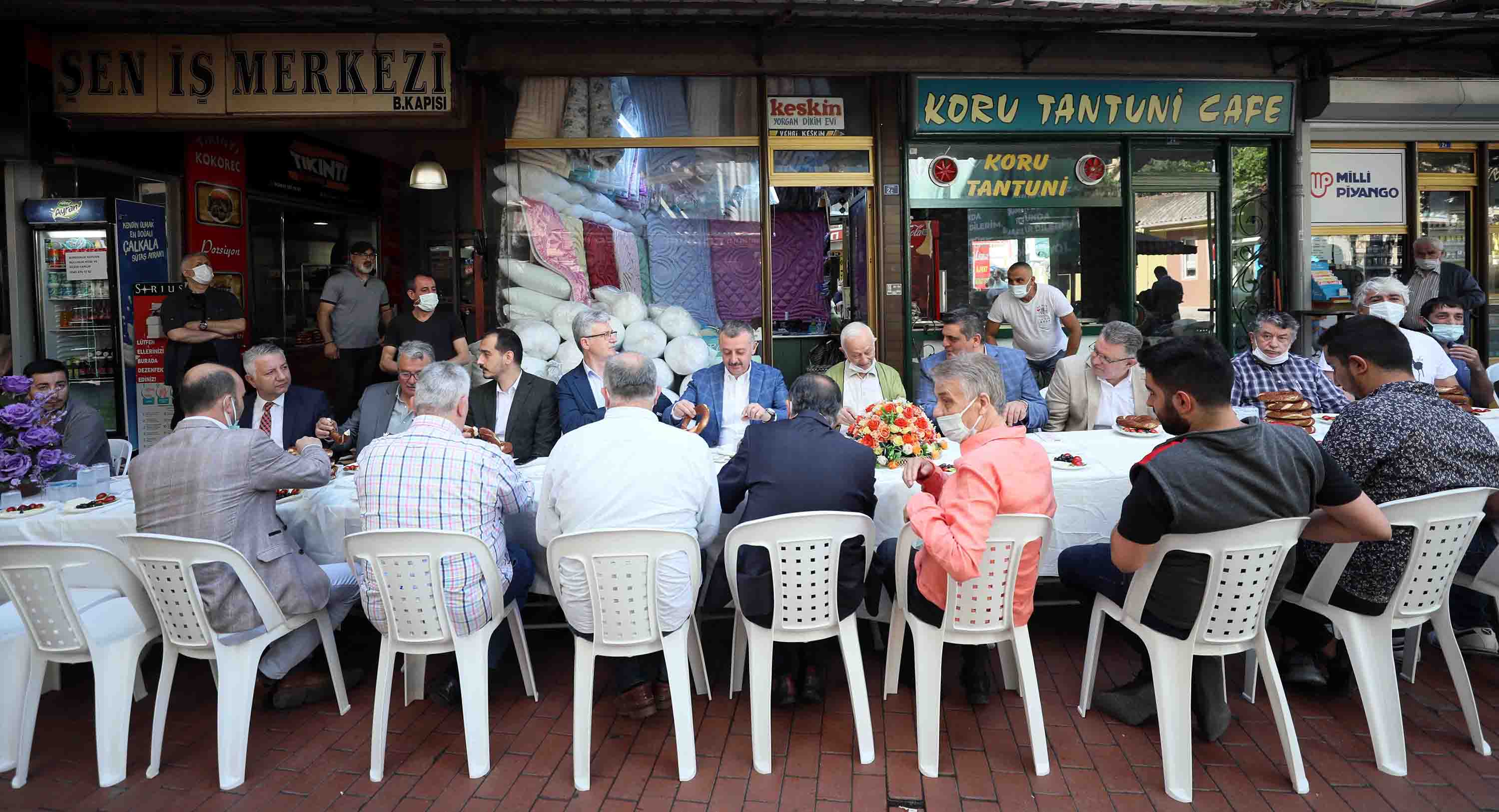 Alemdar Caddesi esnafları altyapı ve üstyapı noktasında hızlı bir çalışma yapan Marmara Belediyeler Birliği ve Kocaeli Büyükşehir Belediye Başkanı Doç. Dr. Tahir Büyükakın’ı, düzenledikleri sabah kahvaltısında ağırladı. Pandemi nedeniyle daha önce bu şekilde düzenledikleri organizasyonu yapamadıklarını söyleyen esnaflar, kahvaltıda Büyükşehir Belediyesi’nin hayata geçirildiği Alemdar Caddesi projesi için Başkan Büyükakın’a teşekkür etti. AK Parti Kocaeli İl Başkanı Mehmet Ellibeş ve AK Parti İzmit İlçe Başkanı Ali Güney’in de yer aldığı birliktelikte, samimi sohbetler yapıldı. Alemdar Caddesi esnafı, Başkan Büyükakın’a yaptıkları çalışma için bir teşekkür pankartı asarken, “Bizi mağdur etmeden çalışmaları en kısa sürede tamamlayan Büyükşehir Belediye Başkanımız Tahir Büyükakın’a teşekkür ediyoruz” ifadelerinin altında da bir hatıra fotoğrafı çektirmeyi ihmal etmedi.