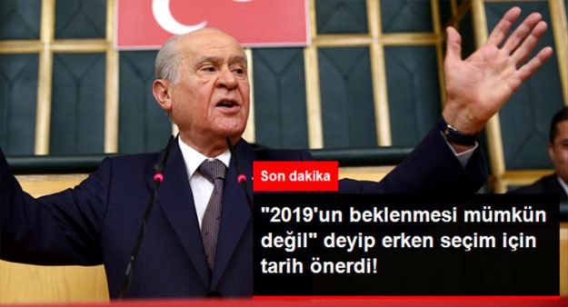 Milliyetçi Hareket Partisi (MHP) Genel Başkanı Devlet Bahçeli, partisinin Meclis grup toplantısında gündeme dair açıklamalarda bulundu. Bahçeli, “Türkiye’nin 3 Kasım 2019’u beklemesi bu şartlarda mümkün değil. 26 Ağustos 2018 günü Türk milleti yeni bir zafer ruhuyla sandığa gidip hem cumhurbaşkanını hem milletvekili yapılması en makul yoldur.” dedi. Cumhurbaşkanı Recep Tayyip Erdoğan ise yarın Sayın Bahçeli ile görüşeceğim açıklaması yaptı. Bir açıklama da CHP’den geldi. CHP, Bahçeli’nin bu çıkışına hodri meydan erken seçime varız diyerek bir açıklama yaptı.