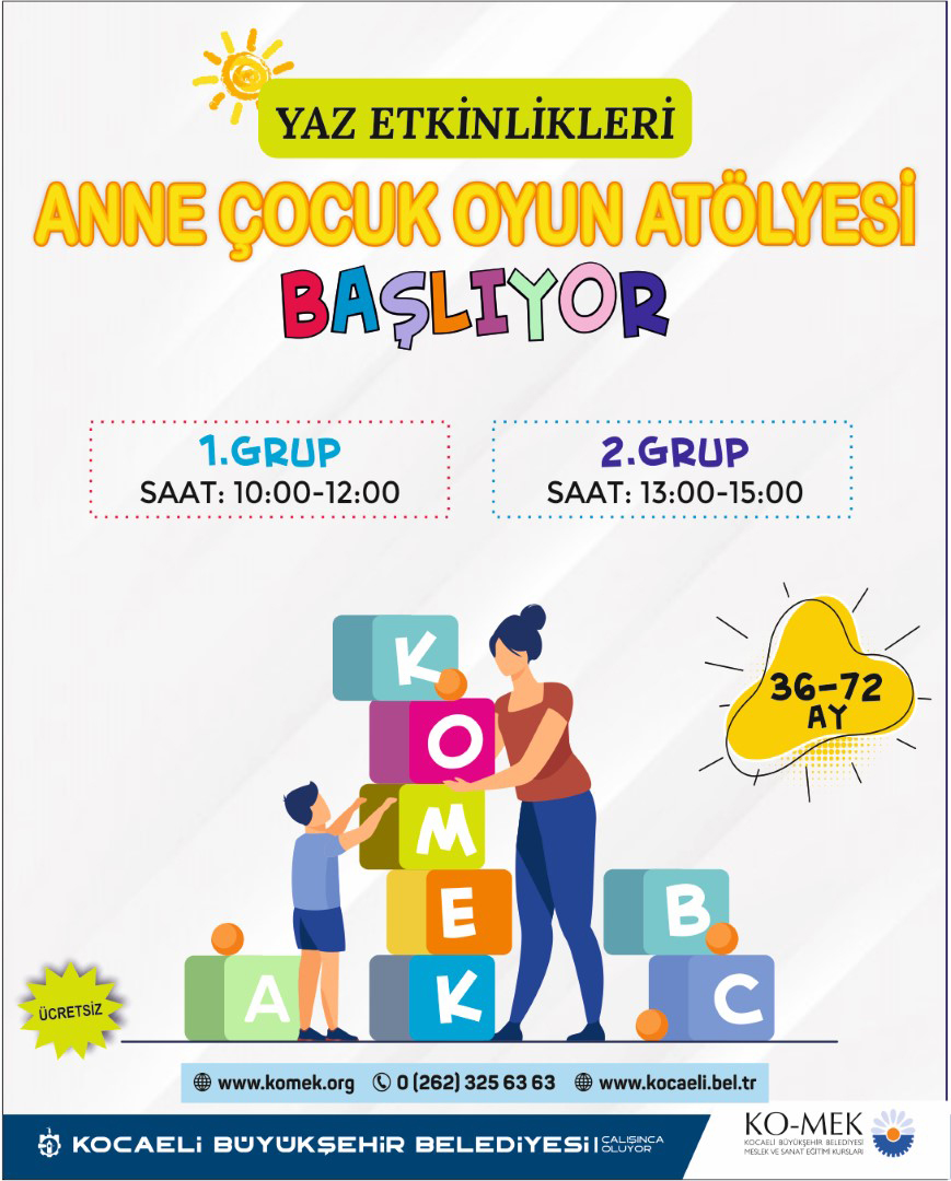 36-72 ay yaş grubu arasındaki çocukların anneleri ile birlikte katılacağı yaz atölyelerinde düzenlenecek olan etkinlikler de KO-MEK’in sanat ve meslek eğitimi veren bir kurum olmasının yanı sıra hayatın her alanında Kocaeli gençliğinin sosyal ve kültürel gelişimine katkı sağlanması planlanıyor. Anne ve çocuklar çocuk oyun odası atölyelerinde doyasıya vakit geçirirken gün boyunca hem eğlenecekler hem de günlük hayatta öğrenmenin tadını çıkaracaklar.