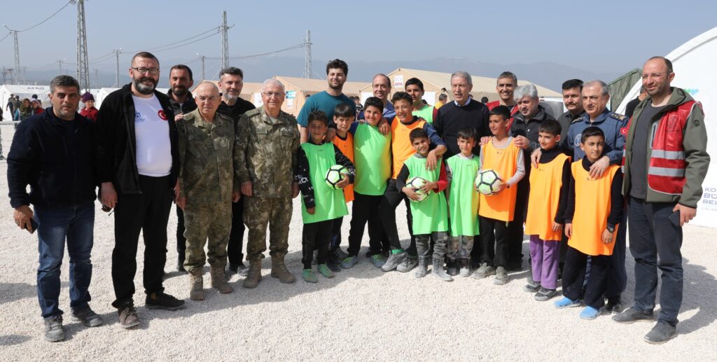 Kocaeli Büyükşehir Belediyesi’nin Hatay’ın Defne ilçesinde kurduğu çadır kenti ziyaret eden Milli Savunma Bakanı Hulusi Akar, mini futbol sahasında çocuklarla futbol oynadı. Depremzedelerle yakından ilgilenen Bakan Akar, daha sonra çadır kenti gezdi ve yapılanlarla ilgili Genel Sekreter Yardımcısı Hasan Aydınlık’tan bilgi aldı. Bakan Akar’a incelemelerinde Genel Kurmay Başkanı Orgeneral Yaşar Güler eşlik etti.