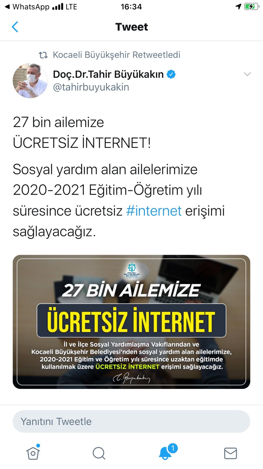 Büyükşehir Belediyesi Başkanı Doç. Dr. Tahir Büyükakın, virüs ile mücadele kapsamında kent genelinde verdiği desteklerine bir yenisini daha ekledi. Başkan Büyükakın, sosyal medya hesabından verdiği mesajla sosyal yardım alan ailelerimize 2020-2021 eğitim-öğretim yılı süresince internet erişimi sağlanacağı müjdesini verdi. Büyükşehir Belediyesi ile il ve ilçe sosyal yardımlaşma vakıflarından sosyal yardım alan ve uzaktan eğitimden yararlanan 27 bin aile Başkan Büyüakın’ın verdiği müjde ile eğitimlerini ücretsiz bir şekilde tamamlayabilecek.
