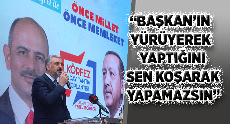 Biz Kocaeli’nin adamını aday yaptık. Onlar ise aday bulamadı. Kendisi cesaret edip aday olamadı. En son bir kardeşimi aday yaptınız. İçinde Pensilvanya’nın, Kandil’in ve Türkiye’nin karşısında olan grupların yer aldığı ittifakın yerli ve milli olması mümkün değildir. Milletimiz zaten bunlara 31 Mart’ta en güzel cevabı verecektir” ifadelerini kullandı.