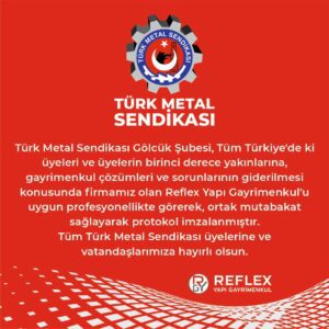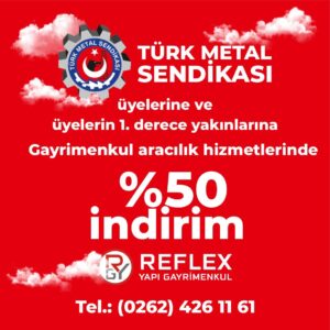 Türk Metal Sendikası Gölcük Şubesi üyelerinin faydalanabilmesi için, şehrimizin güvenilir ve geniş portföyü olan Reflex Yapı Gayrimenkul ile indirim anlaşması sağladı.