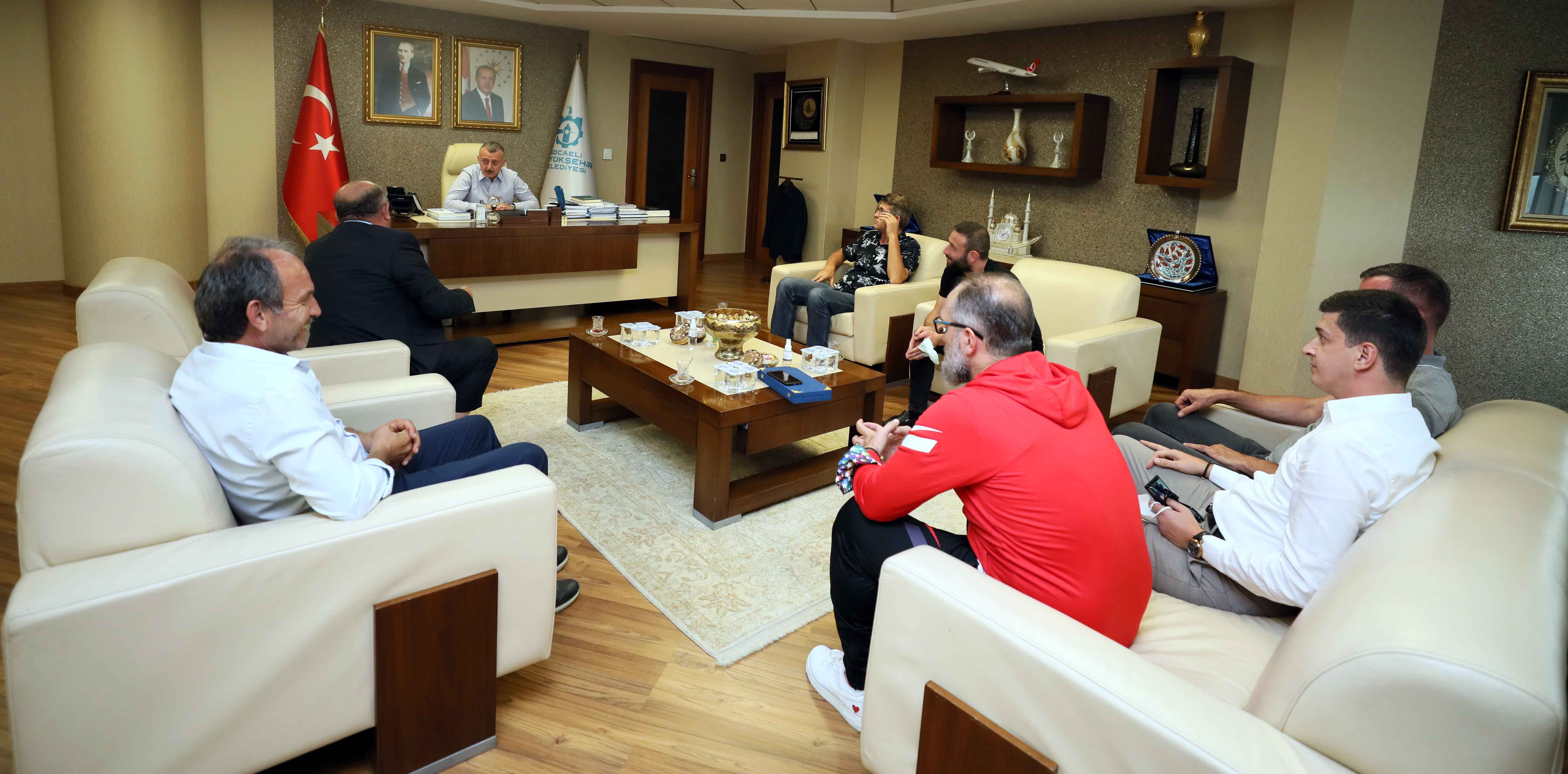 Marmara Belediyeler Birliği ve Kocaeli Büyükşehir Belediye Başkanı Doç. Dr. Tahir Büyükakın, Kandıra Belediye Başkanı Adnan Turan ve Garnizon Komutanı Piyade Albay Semih Koç, Kocaeli Rizeliler Dernek Başkanı Ekrem Kumuşoğlu ile yönetimlerinin yanı sıra Doğantepespor Kulüp Başkanı Mithat Öztürk, Yuvacıkspor Kulüp Başkanı Engin Özkaraaslan ile teknik direktör Fatih Kurtoğlu’nu makamında konuk etti. Sanattan spora, kültürden sağlığa, sağlıktan sosyal alana kadar birçok alanda hizmet veren sivil toplum kuruluşlarıyla her fırsatta bir araya gelen Başkan Büyükakın, “Vatandaşlarımızın mutlu olduğu çalışmalarımızı hayata geçirirken, sosyal hayata dönük adımlarımızı da atıyoruz. Bu konuda STK’larımıza da büyük bir görev düşmektedir. Milletimizin birlik ve beraberliğine dönük çalışmalar, kadim kültürümüzün geleceğe taşınması, gençlerimizin spor yapması ve buna dönük adımların atılmasını çok önemli buluyoruz” dedi.