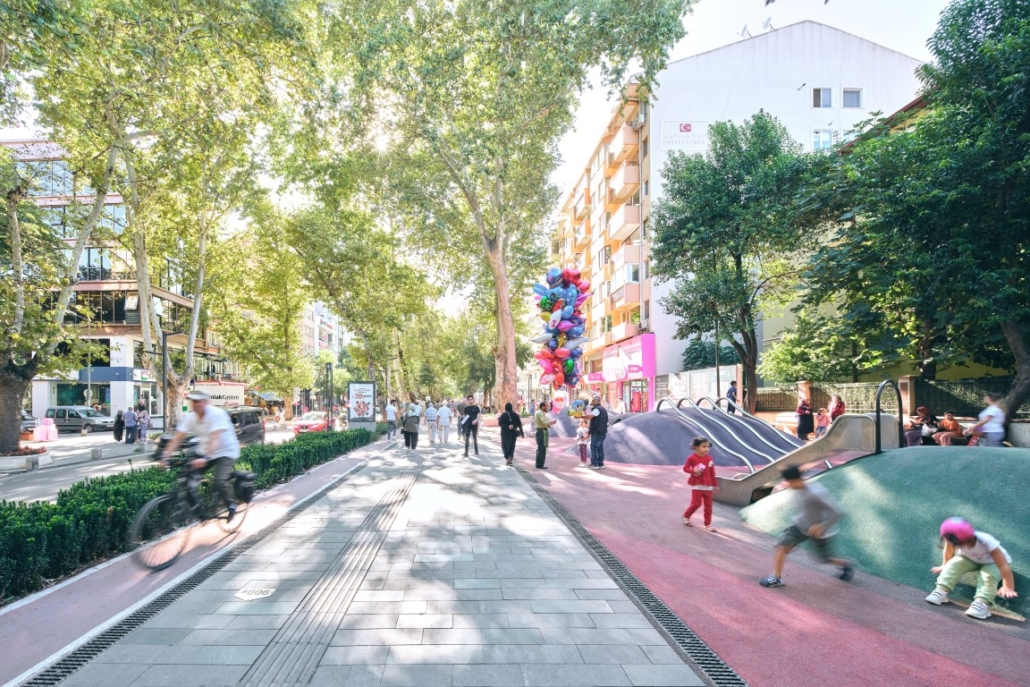 Yapı Dergisi’nde şu ifadelere yer verildi: “Öncelikle iki eski araç yolu arasında kalan ve karşıdan karşıya geçişlerde bir engel oluşturan yüksek yürüyüş yolu, alanın yeniden tesviye edilmesi ile mevcuttaki kaldırımlarla bütünleştirilmiş. Koruma altındaki çınarların etrafını çevreleyen imalaralar, geçirimli betonla değiştirilip ağaç köklerinin su alması sağlanmış. Ayrıca yeni tasarlanan oturma bankları bu ağaçları çevreleyip onları koruyacak şekilde tasarlanmış. Bu oturmalar ziyaretçilerin cadde boyunca kamusal alanın merkezinde, çınarların gölgesinde, cadde seslerini dinleyerek vakit geçirmelerine olanak tanıyor.