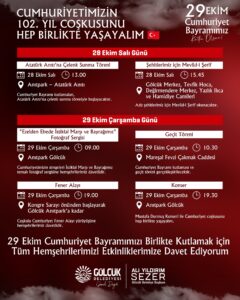 Askerî birliklerin, okulların ve kurumların geçişlerinin yapılacağı törende; şiir ve halk oyunları gösterileriyle vatandaşlar Cumhuriyet coşkusunu doya doya yaşayacak. İlçede gün boyu devam edecek olan kutlamalar, saat 19.00’da Kavaklı Kongre Sarayı önünden başlayacak fener alayı yürüyüşü ile devam edecek. Ellerinde Türk bayrakları ile yürüyüşe katılacak Gölcüklüler, Cumhuriyet coşkusunu bir kez daha Anıtpark’a taşıyacak.