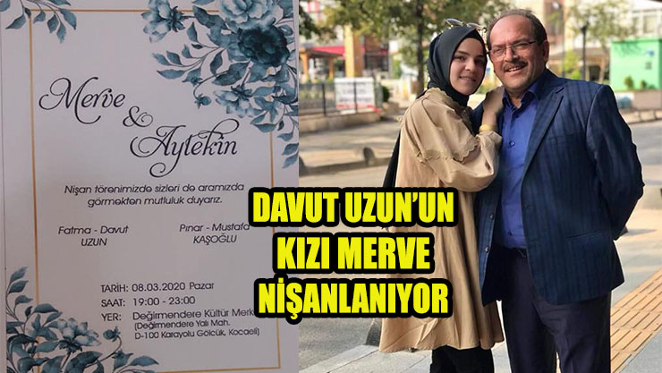 Önceki dönem meclis üyesi, İlçemizin köklü ve tanınmış esnaflarından Uzunoğlu Zücaciye’nin sahibi Davut Uzun’un kızı merve evliliğe ilk adımını atacak. 08 Mart Pazar günü Değirmendere Kültür Merkezinde Merve ve Aytekin nişanlanıyor. Uzun; “Pazar Günü Kızım Mervenin Nişan Cemiyetine Tüm Sevenlerimizi Bekliyoruz” diyor. Bizde Gölcük Vizyon Gazetesi olarak Merve Aytekin’e, mutluluklar diliyoruz.