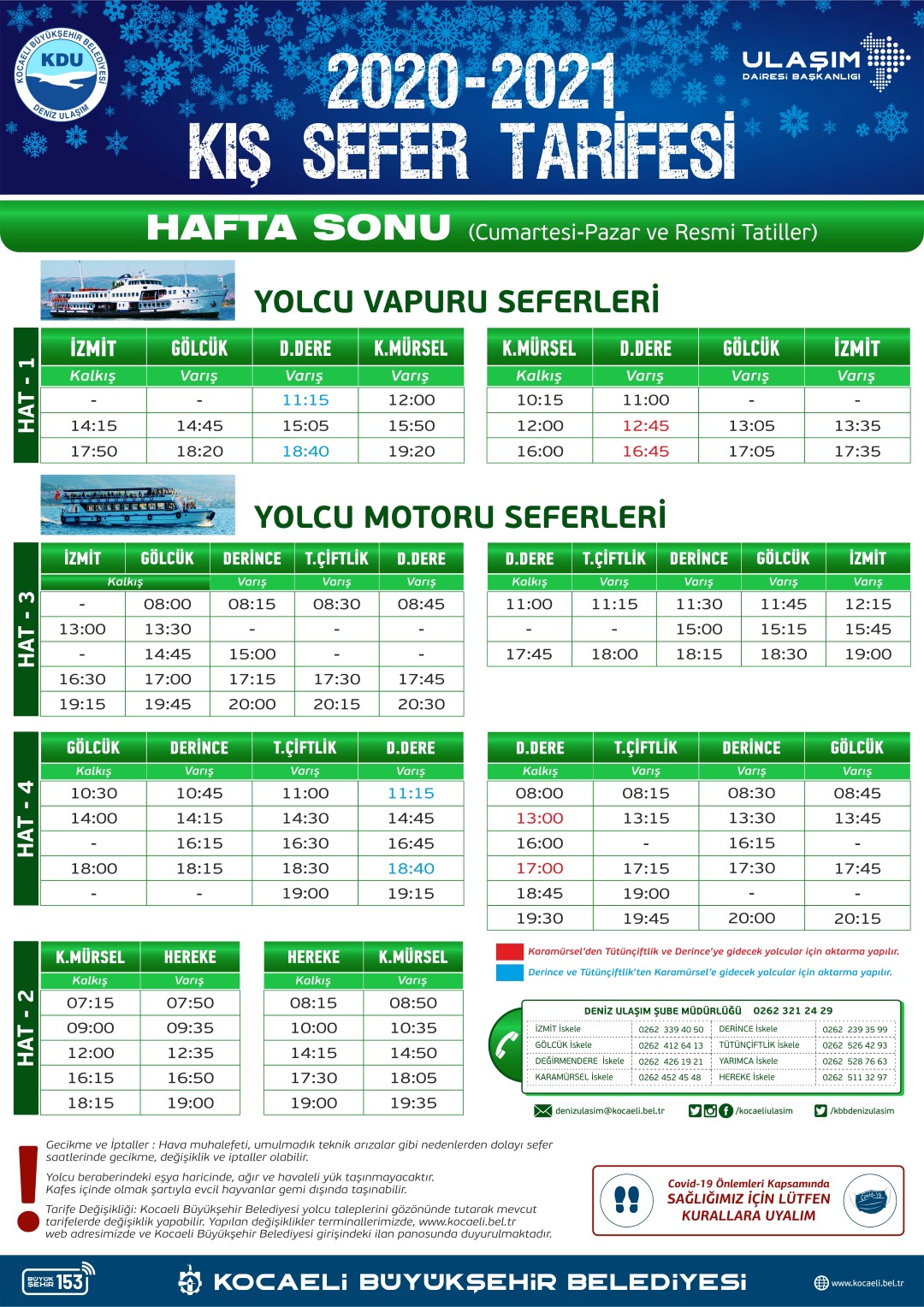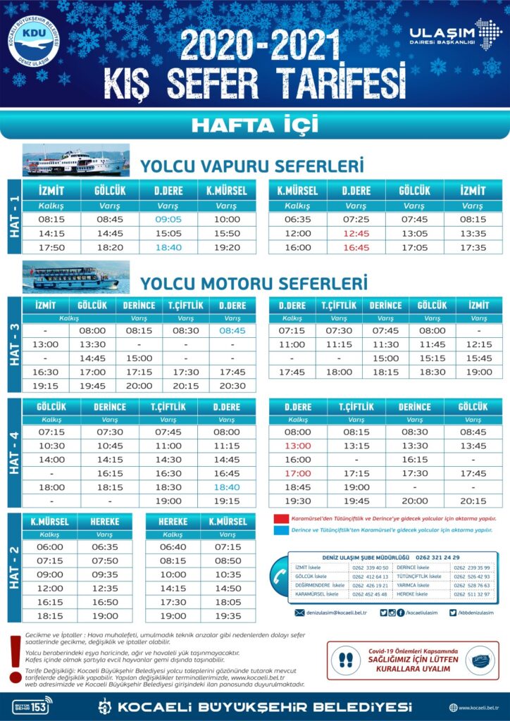 Öte yandan Yolcu Motoru Seferleri Hat 2, Karamürsel – Hereke güzergâhında, Hat 3. İzmit – Gölcük – Derince – T.Çiftlik – Değirmendere güzergâhında ve Hat 4. Gölcük – Derince – T.Çiftlik – Değirmendere arasında gidiş dönüş olarak 21 Eylül 2020 Pazartesi gününden itibaren deniz ulaşımında kış tarifesine geçti. Deniz ulaşımında kış sefer tarifesi, Kocaeli Büyükşehir Belediyesi’nin www.kocaeli.bel.tr internet sitesinde Vapur Saatleri linkinden takip edilebilir.