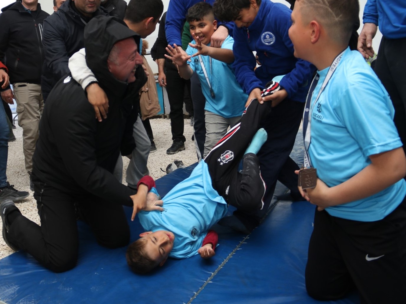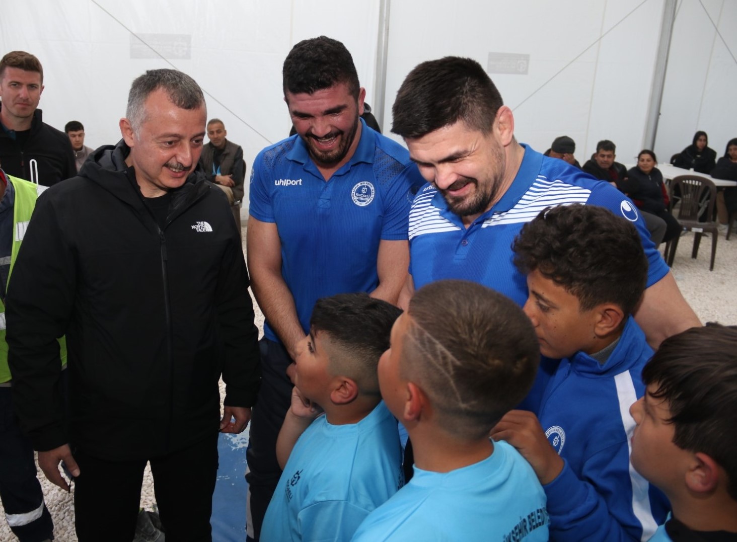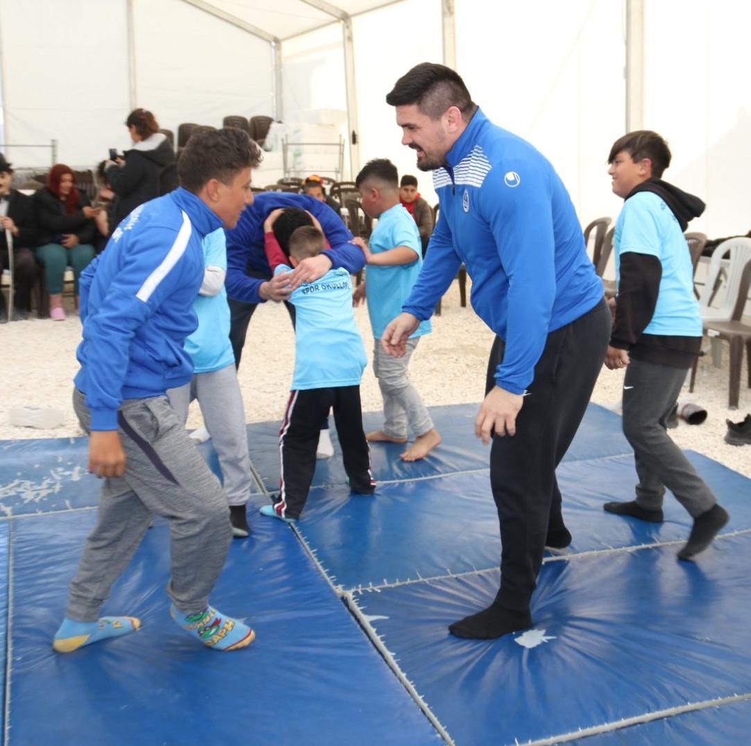 Büyükşehir’in Defne’deki çadır kentinde depremzede çocuklarla mindere çıkarak güreş tutan başpehlivanlar, çocukların keyifli anlar geçirmesini sağladı