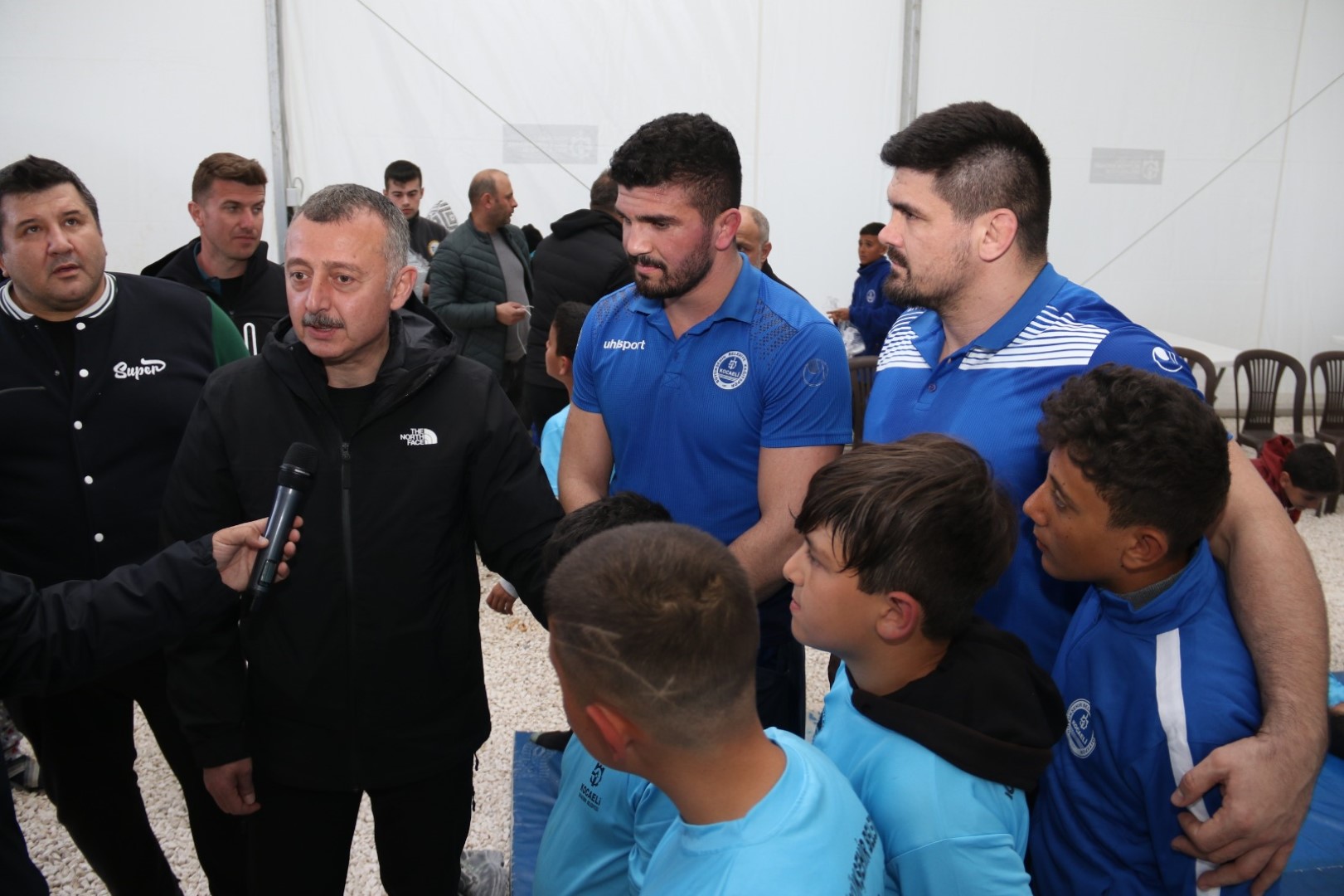 Deprem bölgesinde yaraların en kısa sürede sarılması için çalışmalarını yoğunlaştırdıklarını söyleyen Başkan Büyükakın, “Defne’deki çadır kentte tam anlamıyla bir yaşam alanı oluşturduk. Bu geçici merkezde istiyoruz ki, başta çocuklarımız olmak üzere tüm misafirlerimiz depremin yaralarını kısa sürede sarsın. Bugün de Kağıtpsporlu başpehlivanlarımızı burada ağırlayarak çocuklarımızla buluşturduk. Çocuklarımızın oldukça eğlendiğini gördük. Hatay’ı ve diğer deprem bölgelerini hep birlikte ayağa kaldıracağız” diye konuştu.