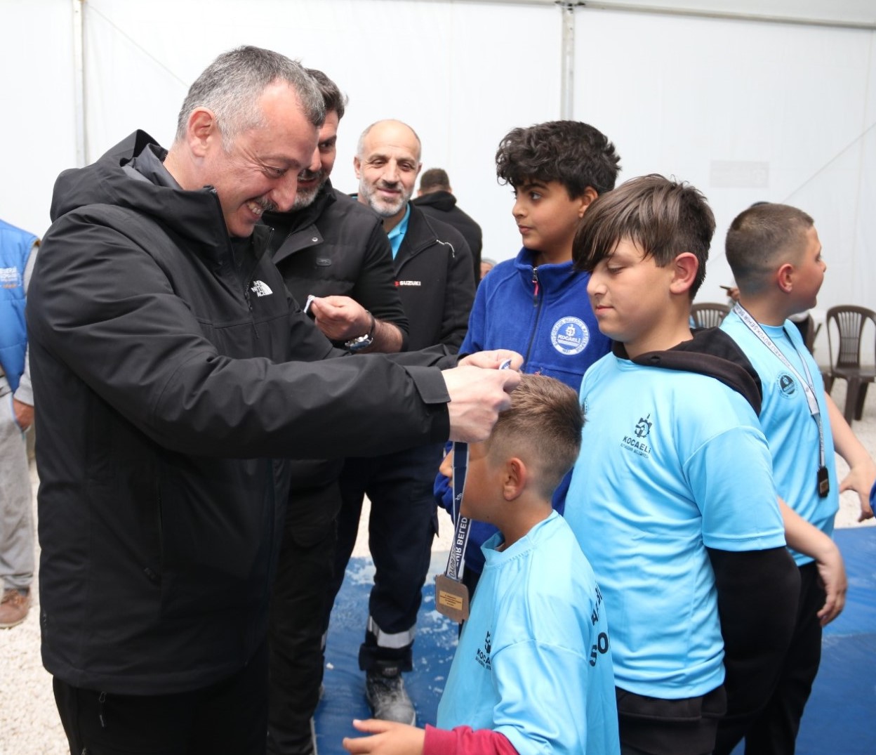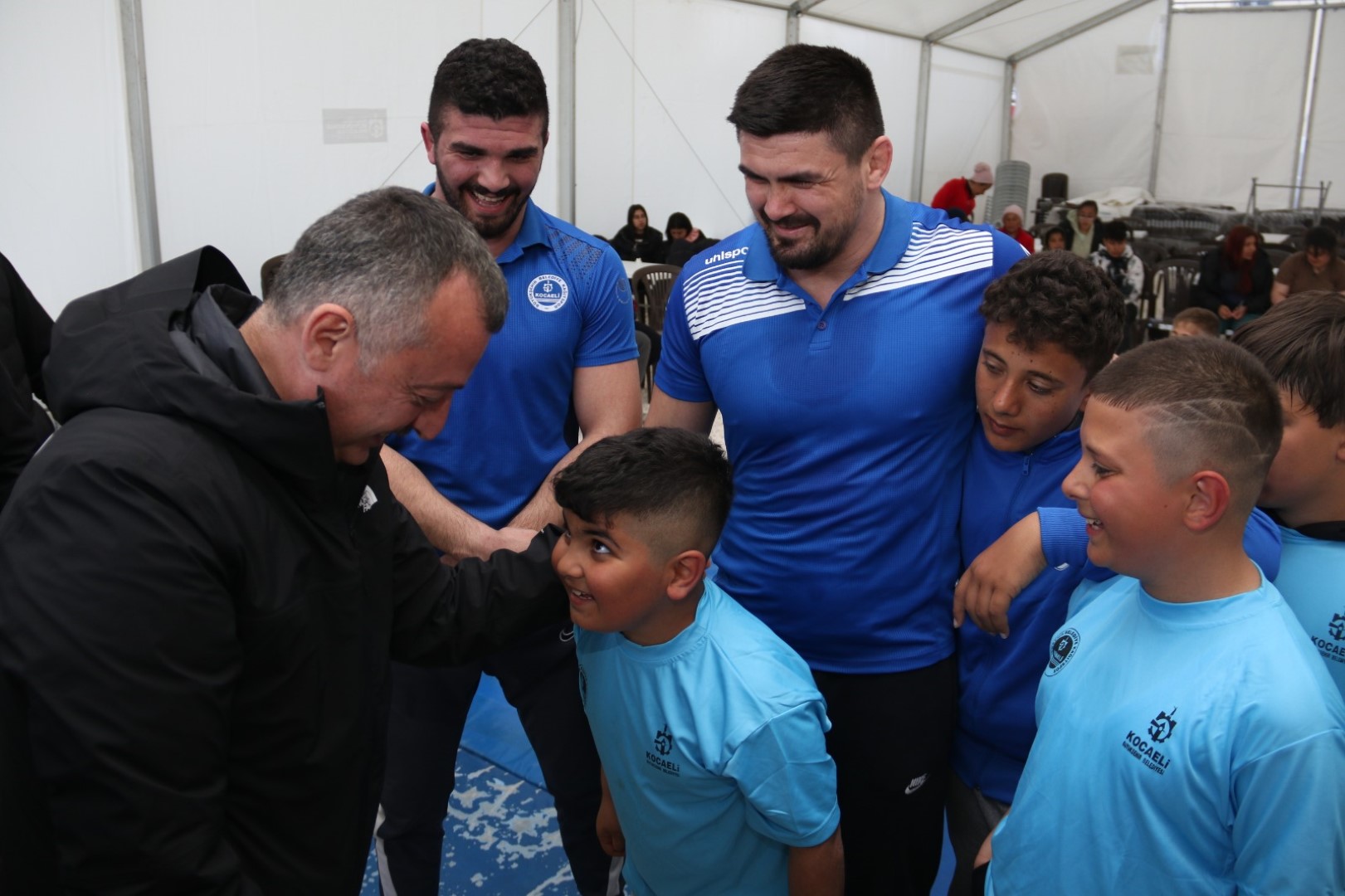 Kocaeli Büyükşehir Belediyesi, Hatay Defne’de inşa ettiği çadır kentte yaraların sarılması için çalışmalarını sürdürüyor. Özellikle çocuklara yönelik faaliyetlerini yoğunlaştıran Büyükşehir, son olarak Kağıtsporlu başpehlivanları Defne’de çocuklarla buluşturdu. Kırkpınar güreşçileri Faruk Akkoyun ve Mustafa Arslan, depremzede çocuklara güreş taktiklerini öğreterek birlikte vakit geçirdi. Kocaeli Büyükşehir Belediye Başkanı Tahir Büyükakın’ın da takip ettiği müsabakalarda başpehlivanları tuş eden çocuklara madalyalarını Başkan Büyükakın taktı.
