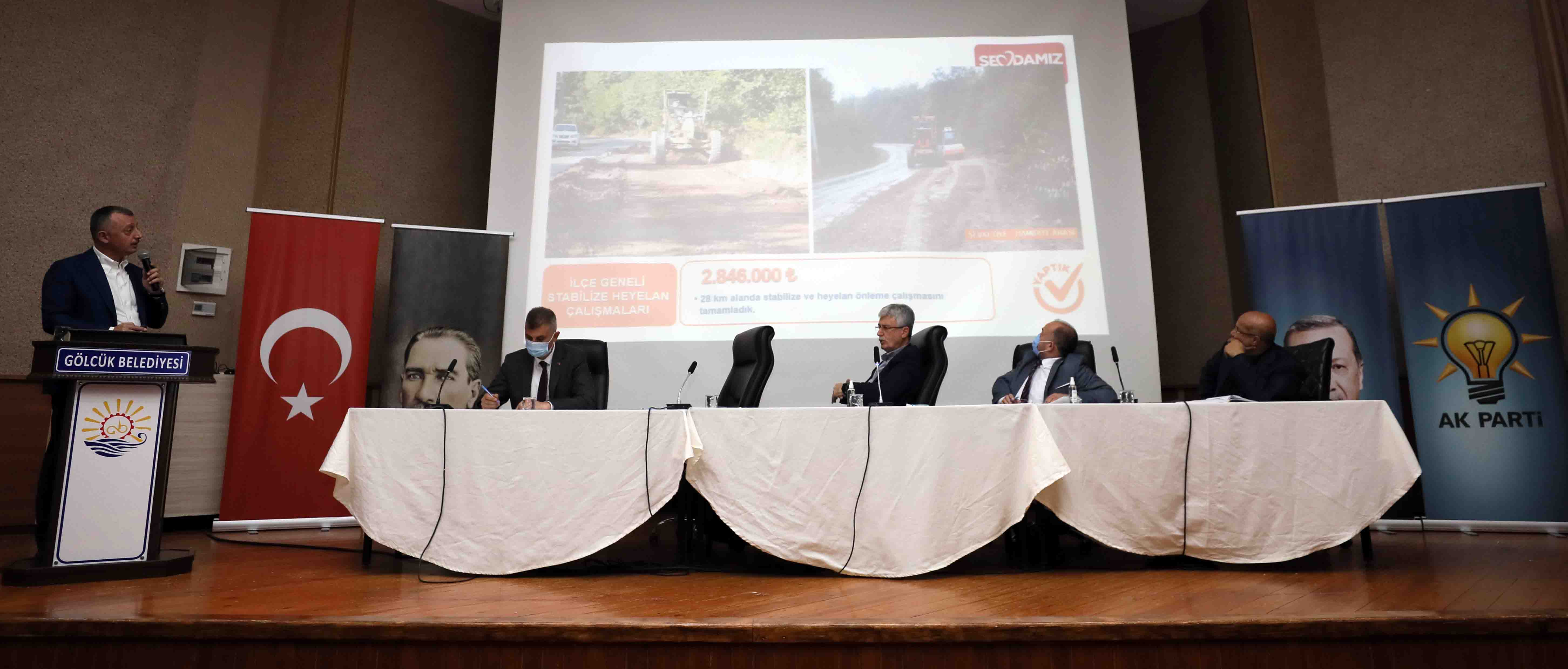 Marmara Belediyeler Birliği ve Kocaeli Büyükşehir Belediye Başkanı Doç.Dr Tahir Büyükakın, AK Parti Kocaeli İl Başkanlığı’nın düzenlediği Mahalle Başkanları toplantılarına katılmayı sürdürüyor. Son olarak Derince ve Gölcük ilçelerinde ki buluşmalara katılan Başkan Büyükakın, burada Büyükşehir Belediyesi’nin yatırımları hakkında mahalle başkanlarına bir sunum yaptı. AK Parti Kocaeli İl Başkan Mehmet Ellibeş’in yanı sıra İlçe Belediye Başkanları Zeki Aygün ve Ali Yıldırım Sezer, İlçe Başkanları Koray Merdan ve Çetin Seymen’in yanı sıra teşkilat üyelerinin de katıldığı toplantıda, “Hizmet ve eser üretmek için hep birlikte büyük bir gayretle çalışıyoruz. Bakınız iki yıllık süreçte sadece Derince ve Gölcük ilçelerimize 217 eser ve hizmet ile 746 Milyon TL’lik yatırım gerçekleştirdik” dedi.
