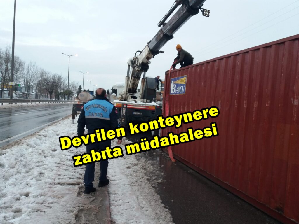 Kocaeli’de birkaç gündür devam eden yoğun kar yağışında Büyükşehir Belediyesi ekipleri yoğun mesai harcıyor. Kandıra Yolu üzerinde kayan bir tırın konteyneri yola savurulurken devriye gezen Kocaeli Büyükşehir Belediyesi Zabıta ekipleri olaya anında müdahale etti.