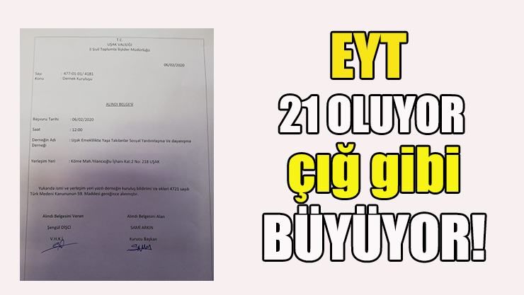 Emeklilikte Yaşa Takılanlar Sosyal Yardımlaşma ve Dayanışma Derneği, il temsilciliklerini derneğe dönüştürmeye ve gidere büyümeye devam ediyor. 2020’de toplam dernek sayısını 50’ye çıkarmayı hedefleyen EYT SYDD, son olarak Uşak EYT SYD Derneği’nin kurulması için Uşak Valiliğine başvurdu. Uşak ile birlikte 21. dernek kurulmuş olacak. Önce bölgesel federasyonları, akabinde de konfederasyonu hayata geçirecek olan EYT SYDD, bu yolda hızla ilerliyor. EYT SYDD İl Koordinatörü Alper Özüpak, Uşak Emeklilikte Yaşa Takılanlar Sosyal Yardımlaşma ve Dayanışma Derneğinin başvurusunu şöyle duyurdu: “Uşak EYT Derneğimizi kurmak için müracaatta bulunan Sami Arkın başkanıma ve yönetim kuruluna başarılar diliyorum. Ege Federasyonumuza üye olacak olan Uşak EYT Derneği, bütün mağdur arkadaşımıza hayırlı olsun. Haklı davamızda Edirne’den Kars’a diye yola çıktık, bugün de Uşak’tayız. Var olun, yolumuz açık olsun. Hak yolunda yürüyen bütün mağdur dostlarımızı, derneklerimize sahip çıkmaya davet ediyoruz.”