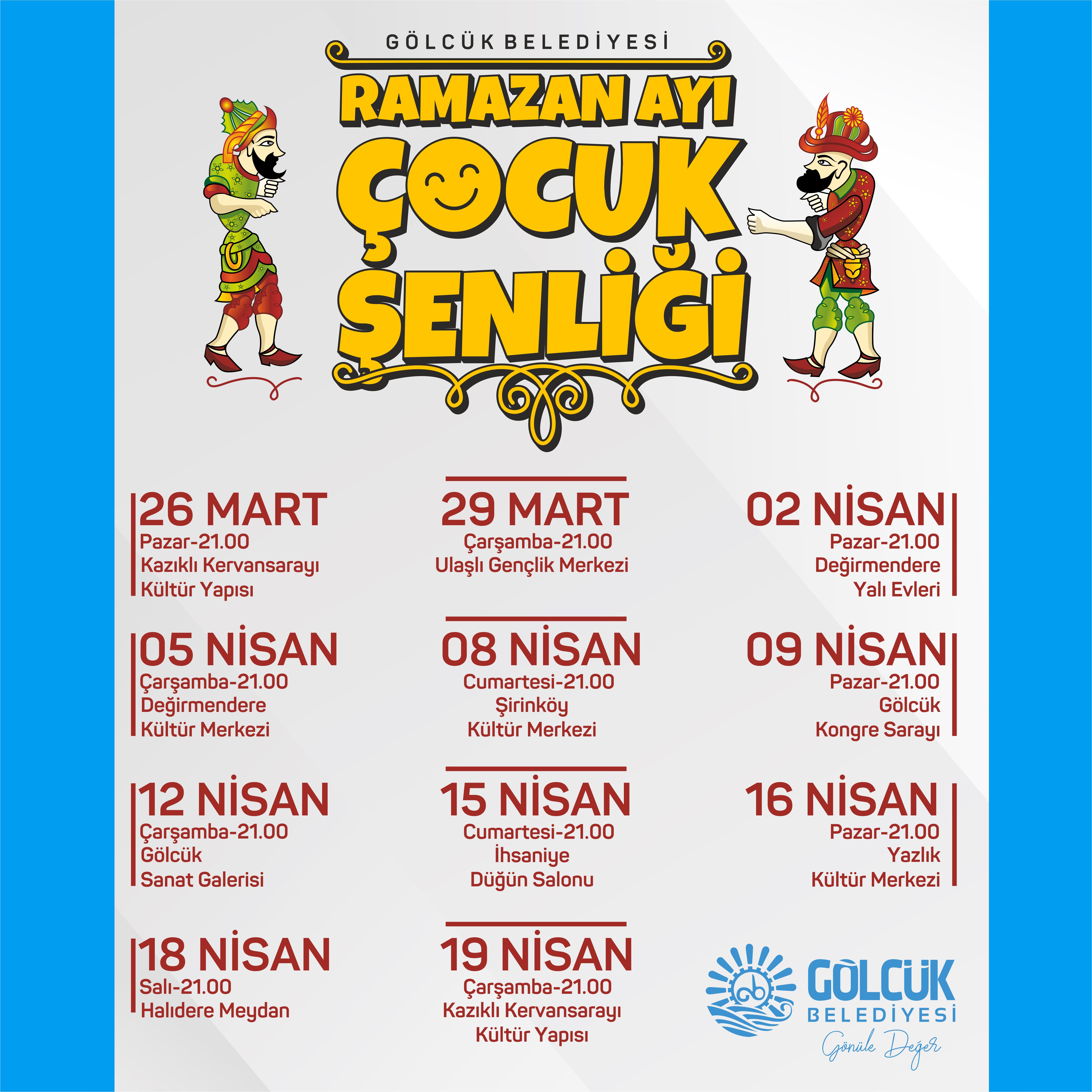 Geleneksel Ramazan ayı eğlenceleri ile dolu Ramazan Ayı Çocuk Şenliği ile çocukların kahkahaları Gölcük’te yankılanacak. Etkinlikler; 29 Mart Çarşamba günü Ulaşlı Gençlik Merkezi, 2 Nisan Pazar günü Değirmendere Yalı Evleri, 5 Nisan Çarşamba günü Değirmendere Kültür Merkezi, 8 Nisan Cumartesi günü Şirinköy Kültür Merkezi, 9 Nisan Pazar günü Gölcük Kongre Sarayı, 12 Nisan Çarşamba günü Gölcük Sanat Galerisi, 15 Nisan Cumartesi günü İhsaniye Düğün Salonu, 16 Nisan Pazar günü Yazlık Kültür Merkezi, 18 Nisan Salı günü Halıdere Meydan ve 19 Nisan Çarşamba günü Kazıklı Kervansarayı Kültür Yapısı’nda düzenlenecek.