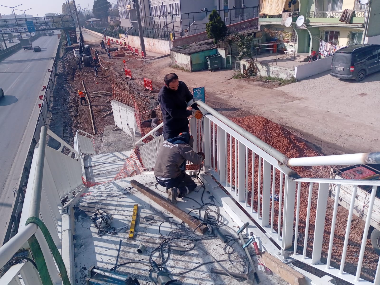 İzmit Kuruçeşme Tramvay Hattında İzmit Lisesi önüne inşa edilen yeni yaya üstgeçidinin zemin kaplama ve diğer montajları devam ediyor