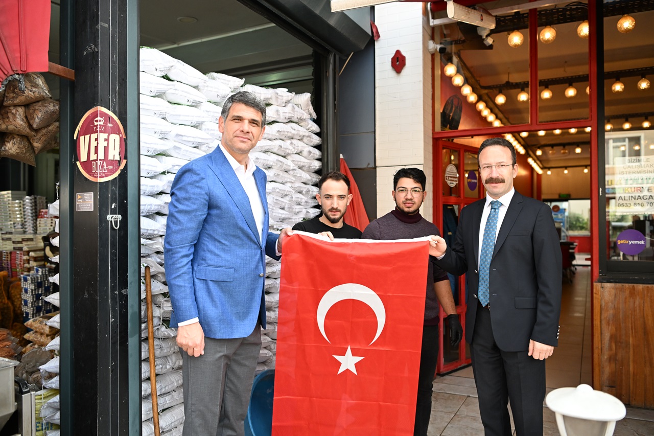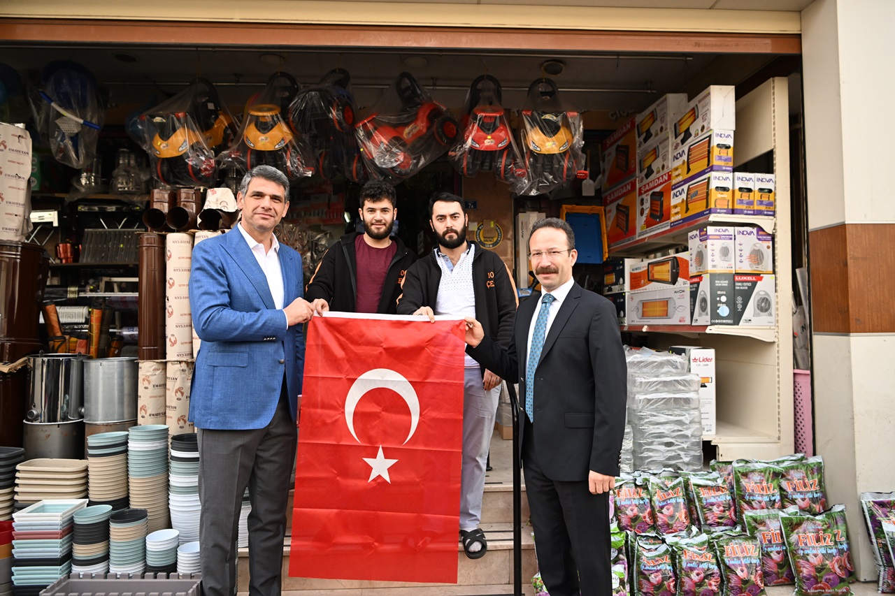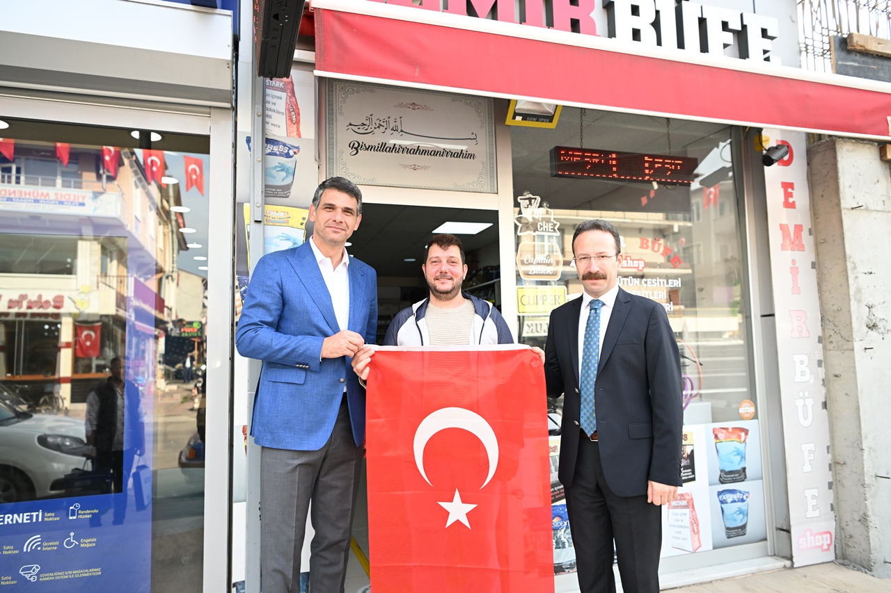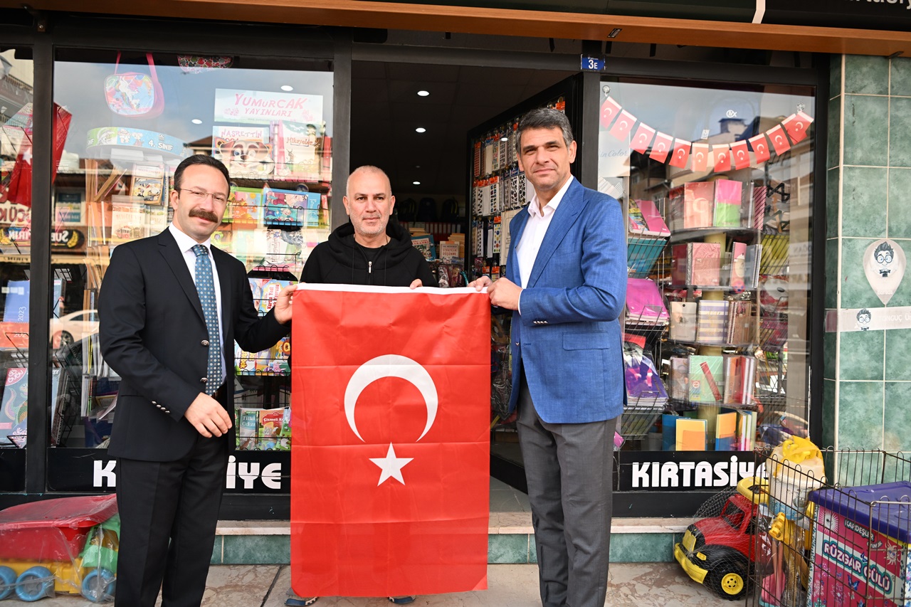 Kartepe Kaymakamı Ömer Hilmi Yamlı ve Kartepe Belediye Başkanı Av.M.Mustafa Kocaman öncülüğünde belediye başkan yardımcıları, birim müdürleri ve meclis üyeleri Kartepeli esnaflara ve vatandaşlara Türk Bayrağı dağıttı.