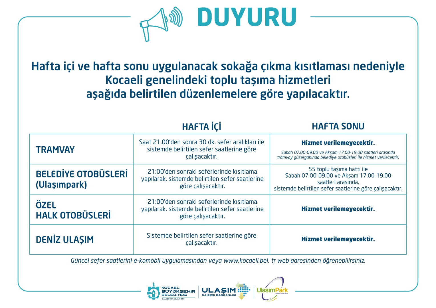 Kocaeli Büyükşehir Belediyesi iştiraklerinden UlaşımPark hafta içi kısıtlama süresince saat 21.00’dan sonraki sefer saatlilerinde kısıtlama yapacak. 21.00’dan sonra UlaşımPark’ın otobüsleri belirtilen sefer saatlerine göre çalışacak. Hafta sonu ise 55 toplu taşıma hattıyla sabah 07.00-09.00, akşam ise 17.00-19.00 saatleri arasında sistemde belirten sefer saatlerine göre hizmet verecek.