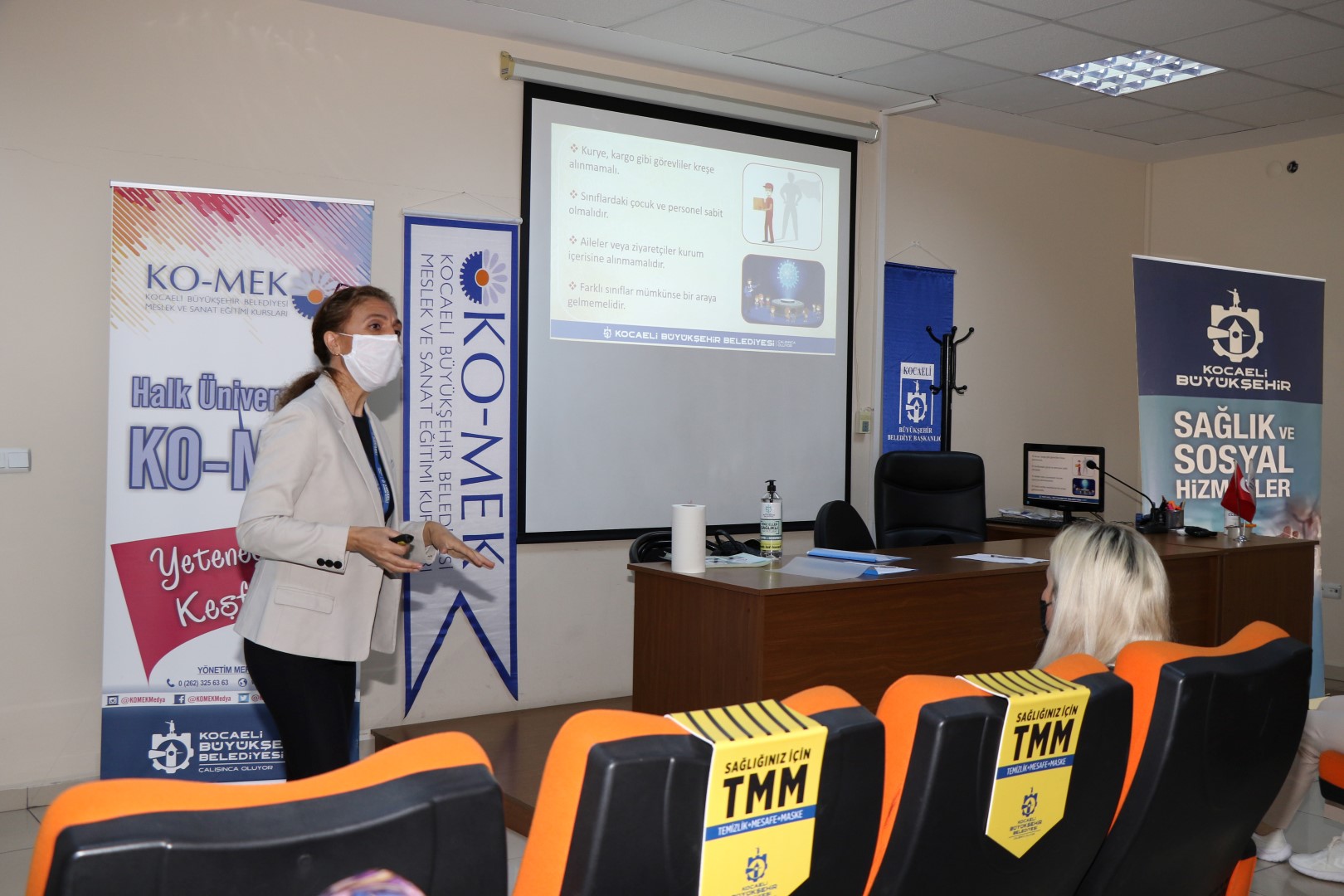 Sağlık ve Sosyal Hizmetler Dairesi Başkanlığı Sağlık İşleri Şube Müdürlüğü, Kocaeli Büyükşehir Belediyesi Meslek ve Sanat Eğitim Kursları (KO-MEK) bünyesinde faaliyet gösteren ve KO-MEK kursiyerlerinin çocuklarının yararlandığı Çocuk Oyun Odaları personeline koronavirüse karşı alınması gereken tedbirler başlığında bir eğitim verdi. Eğitim, Çocuk Oyun Odalarına gelen minikleri, olası virüsün etkilerinden korumak anlamında büyük önem taşıyor.