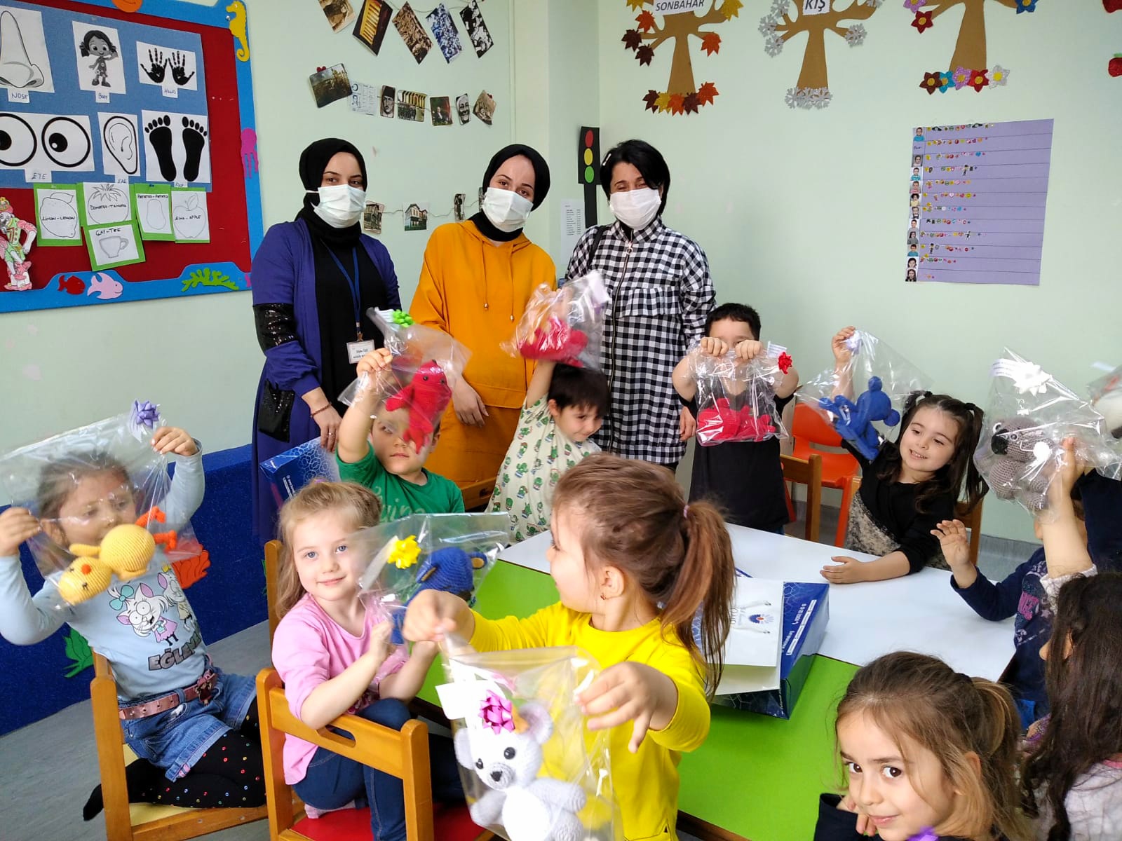 Derince Eğitim Araştırma Hastanesi’ndeki sağlık çalışanlarının çocuklarına çizgi kahramanlarını amigurumi tekniği ile örerek hediye eden kursiyerler, çocukların yanında olarak karne sevinçlerini birlikte yaşadı. Karne hediyelerini alan çocuklar oyuncaklarla kreşte bir süre oynadıktan sonra mutluluklarını akşam iş dönüşü anne babalarıyla birlikte yaşadılar.