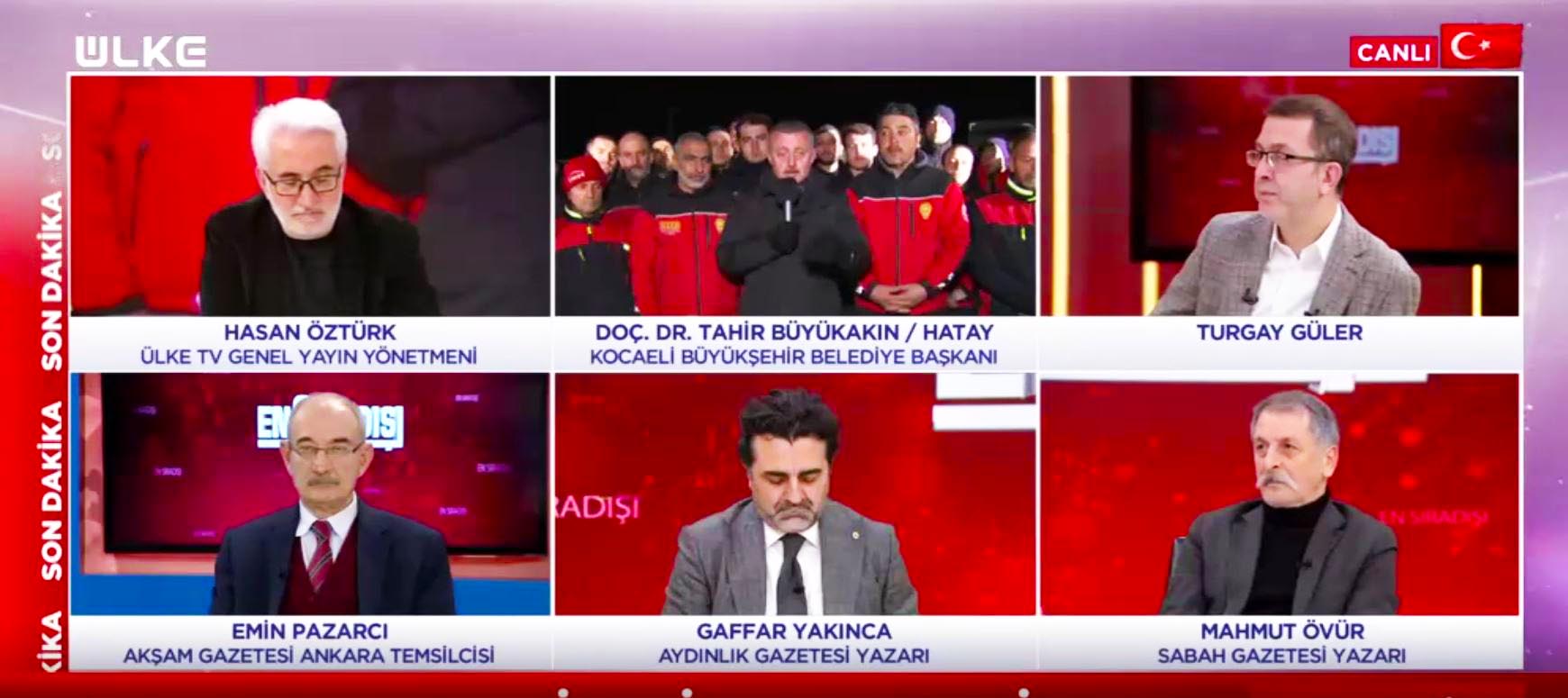 Kocaeli Büyükşehir Belediye Başkanı Tahir Büyükakın, deprem bölgesinden Ülke Tv’nin canlı yayınına katıldı. Hatay’ın Defne ilçesinde bulunan ve Büyükşehir’in deprem bölgesinde görev yapan tüm ekiplerini koordine eden Başkan Büyükakın, programın yapımcısı Turgay Güler ve stüdyodaki konuklarının sorularını yanıtladı. Kahramanmaraş merkezli depremin ardından yaşananlar, Büyükşehir’in bölgedeki çalışmaları ve olası Marmara depremine Kocaeli’nin nasıl hazırlandığı yönünde açıklamalarda bulunan Başkan Büyükakın, ‘’Türkiye burada tek yürek oldu, birlikte atıyor. Ülkemiz deprem kuşağında, fay hatları üzerinde ama bu milletin kalbinde yüreğinde fay hattı yok’’’ dedi.