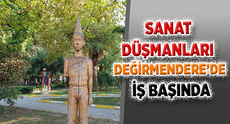 Değirmendere’nin sembolü olan ahşap heykellere kendini bilmez sanat düşmanları zarar veriyor. Heykellerin üstlerine bir çok yazı yazan bu kendini bilmezler, geçtiğimiz yıl tadilattan geçen heykelin kolunu da yine kırmışlar.