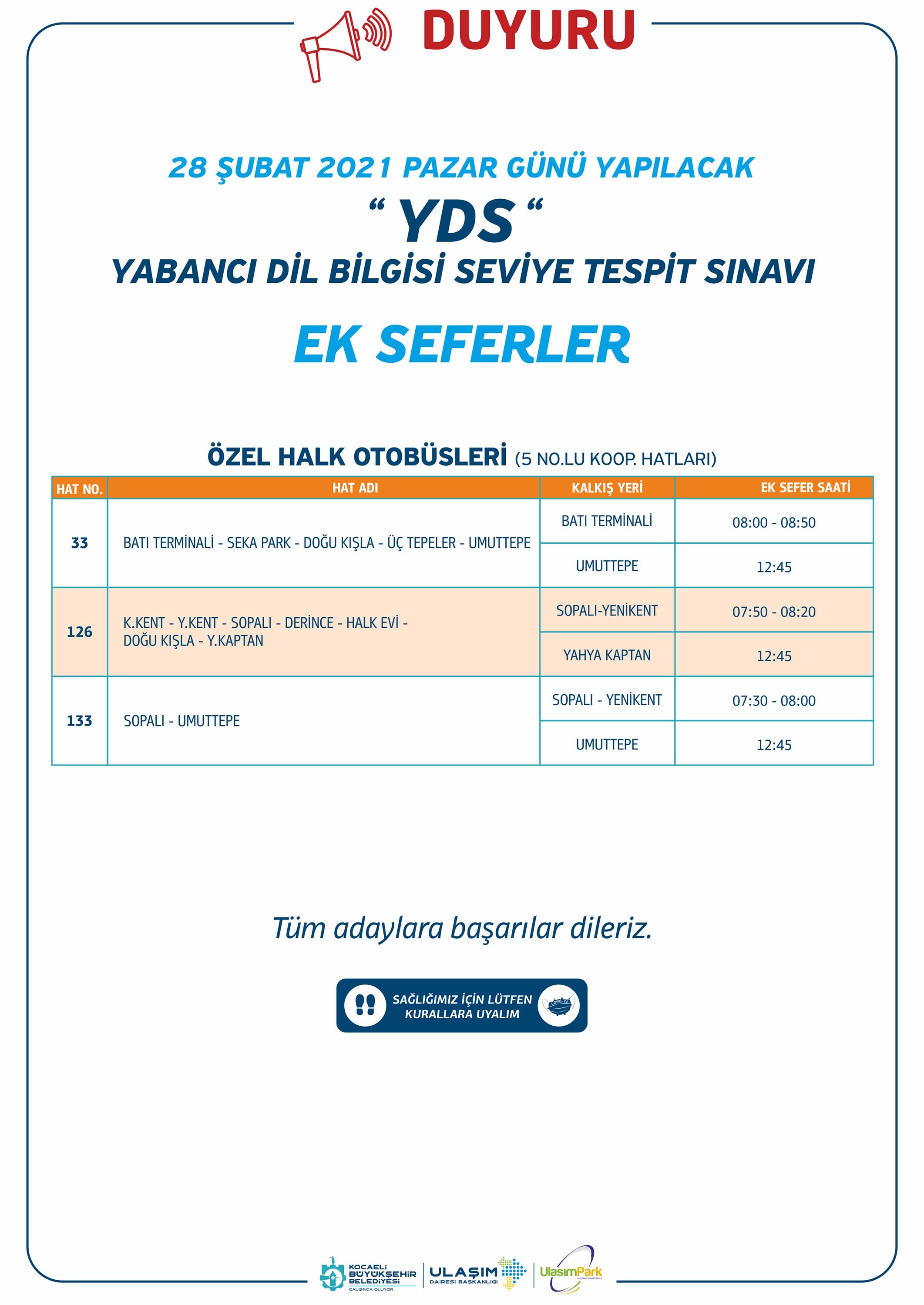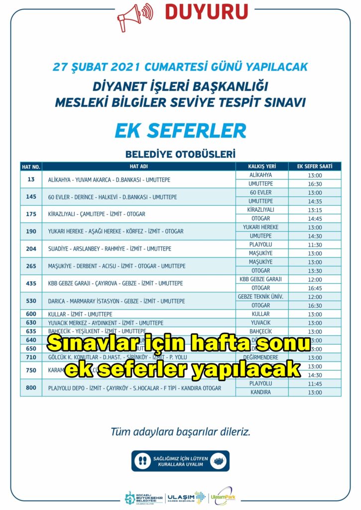27 Şubat 2021 Cumartesi günü Diyanet İşleri Başkanlığınca Mesleki Bilgiler Yeterlilik Sınavı için 16 hatta ek sefer yapılacak. Ek Sefer yapacak hatlar ise; 13, 145, 175, 190, 204, 265, 435, 530, 600, 630, 635, 640, 650, 710, 750 ve 800.