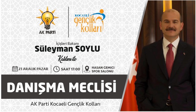 AK Parti İl Gençlik Kolları Başkanlığı tarafından 23 Aralık tarihinde altıncısı düzenlenecek Genişletilmiş İl Danışma Meclisi’ne İç İşleri Bakanı Süleyman Soylu katılacak. Hasan Gemici Spor Salonu’nda saat 17.00’de gerçekleşecek olan danışma meclisinde Kocaeli Gençliği, yerel seçimlere hazır olduğunun mesajını verecek.