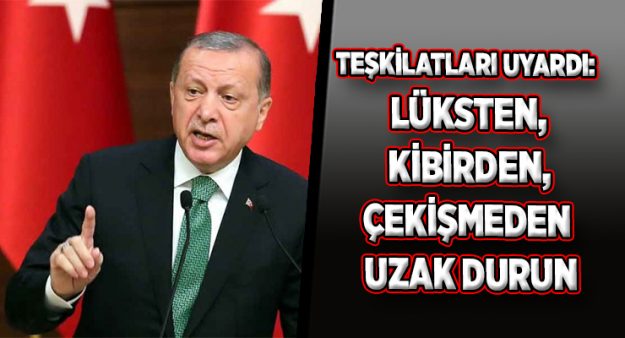 Cumhurbaşkanı Tayyip Erdoğan, il teşkilatlarına gönderdiği görüntülü mesajda, “Toplumun her kesimine yönelik etkinlikler planlayın. Lüksten, kibirden, çekişmeden uzak durun” uyarısı yaptı.