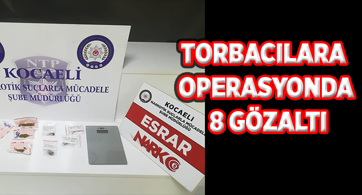 Kocaeli, İl Emniyet Müdürlüğü Narkotik Suçlarla Mücadele Şube Müdürlüğü tarafından Pazartesi günü ‘Torbacı’ olarak adlandırılan sokak satıcılarına yönelik operasyon düzenlendi. Operasyonda 8 kişi gözaltına alındı.