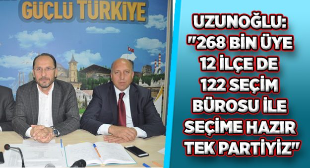 AK Partinin Kocaelideki 268 bin üyesi ile sahada olacağını belirten İl SKM Başkanı Mehmet Uzunoğlu Tüm ilçelerde SKM binalarımızı ve yönetimlerimizi belirledik. Bize bu görevi veren il ve ilçe yöneticilerimize teşekkür ediyorum. Tüm kongrelerini yapmış yarın seçim oyacakmış gibi mahalle koordinasyon toplantılarını tamamlayan mahallelerin tamamını kapsayan çalışmalara imza atan bir teşkilattan bahsediyoruz. 462 mahalle başkan ve teşkilat yapısını tamamlayan daha önceki seçimde aldığı oyu ve bundan sonra alacak oyun hedefini belirleyen bir teşkilatız.