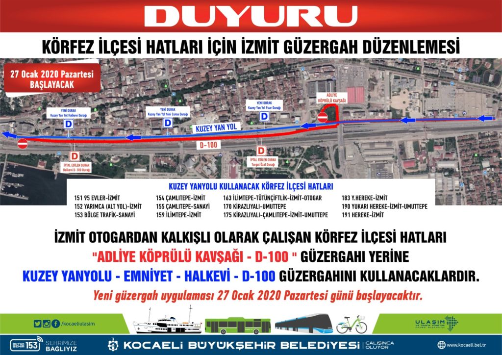Güzergah değişikliği İzmit kalkış istikametinden Körfez ilçesine giden araçlar için değişti. Değişiklik İzmit Otogar kalkışından sonra Adliye Köprülü Kavşağı D-100 bağlantı güzergahını kullanan araçları kapsıyor. Bundan sonra yolcu otobüsleri otogardan kalkıştan sonra İzmit merkezine geldiklerinde Adliye Köprülü Kavşağı’ndan dönerek D-100 karayoluna çıkmayıp, Kuzey Yan yolunu kullanacak. Otobüsler Kuzey Yan Yol üzerinde bulunan Turgut Özal, Mimar Sinan Köprüsü ve Halkevi duraklarından yolcu alacak.